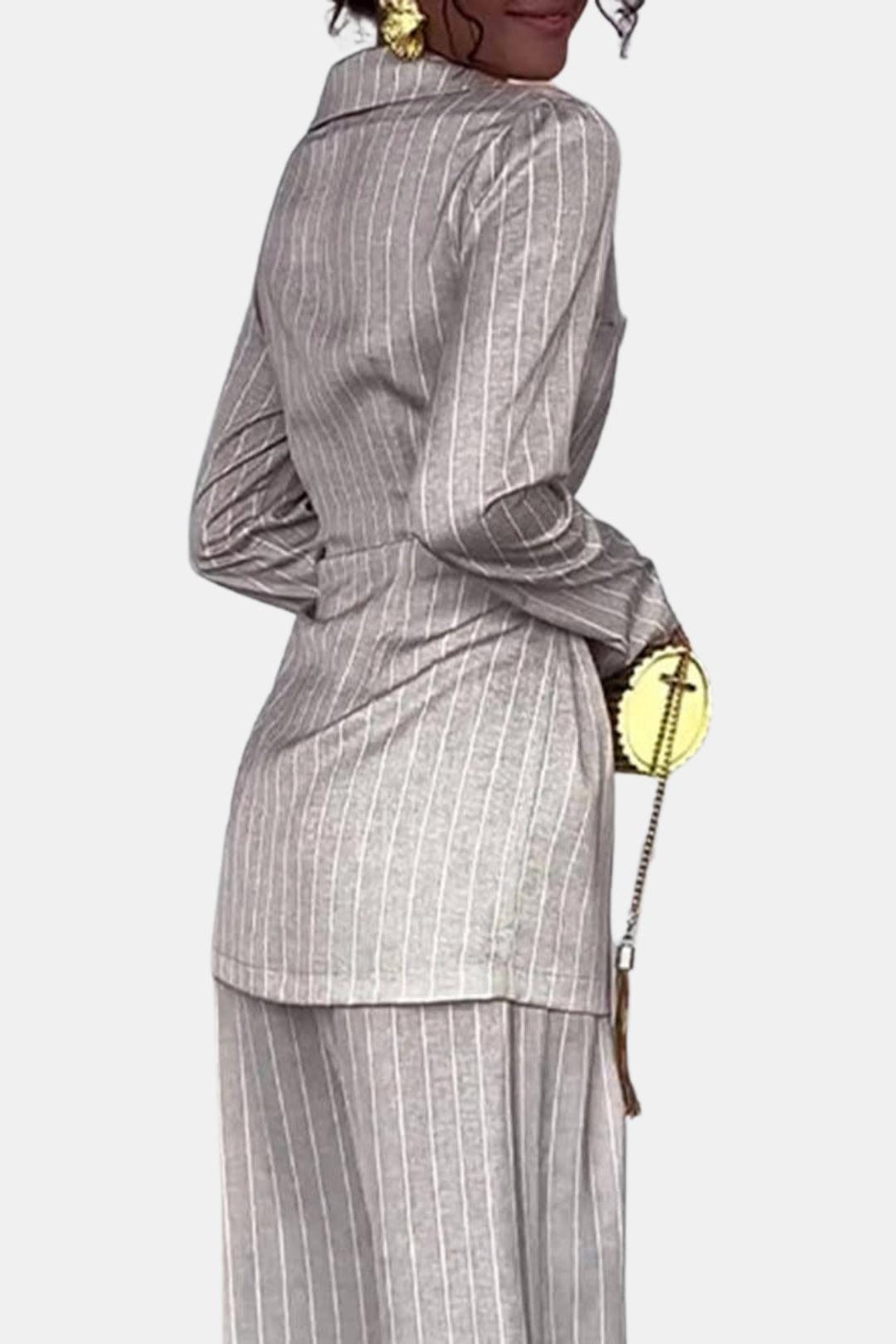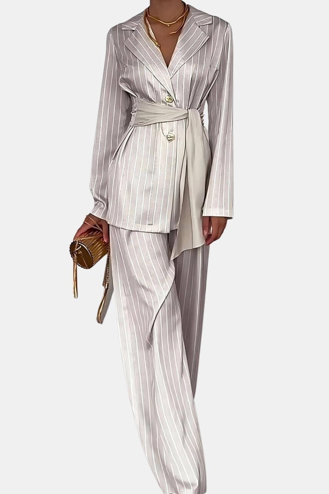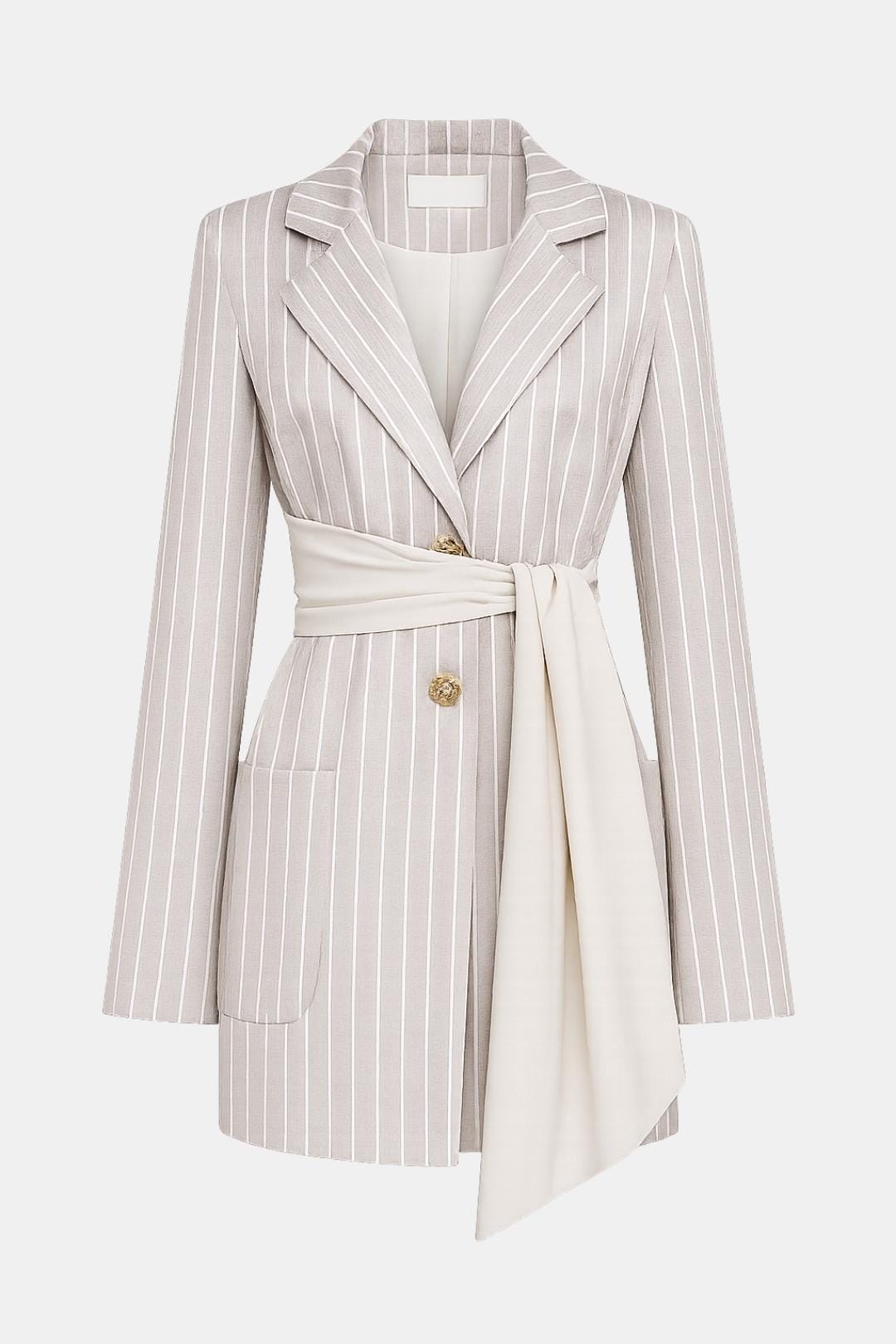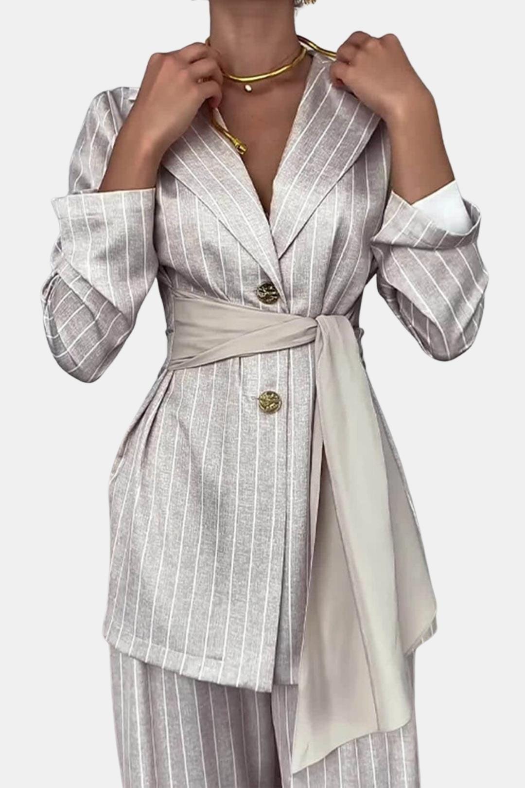 Brynlee – Striped Tie-Waist Lapel Blazer in Grey