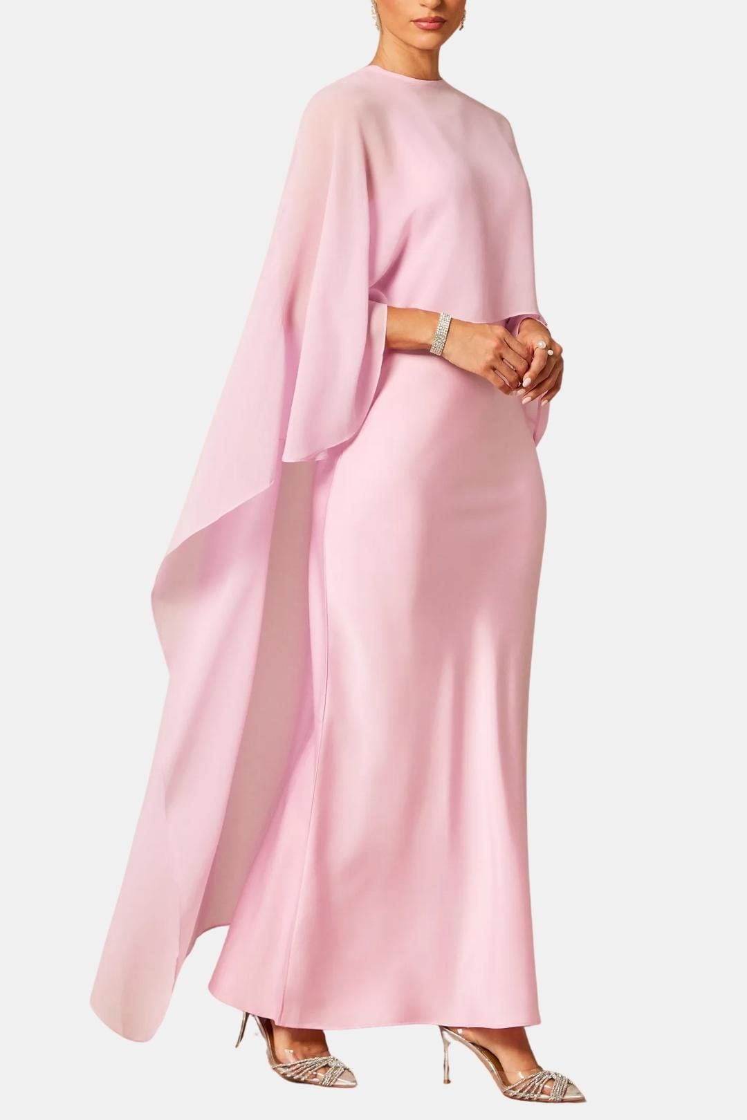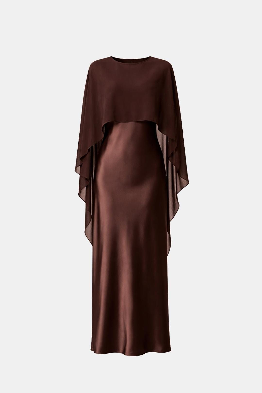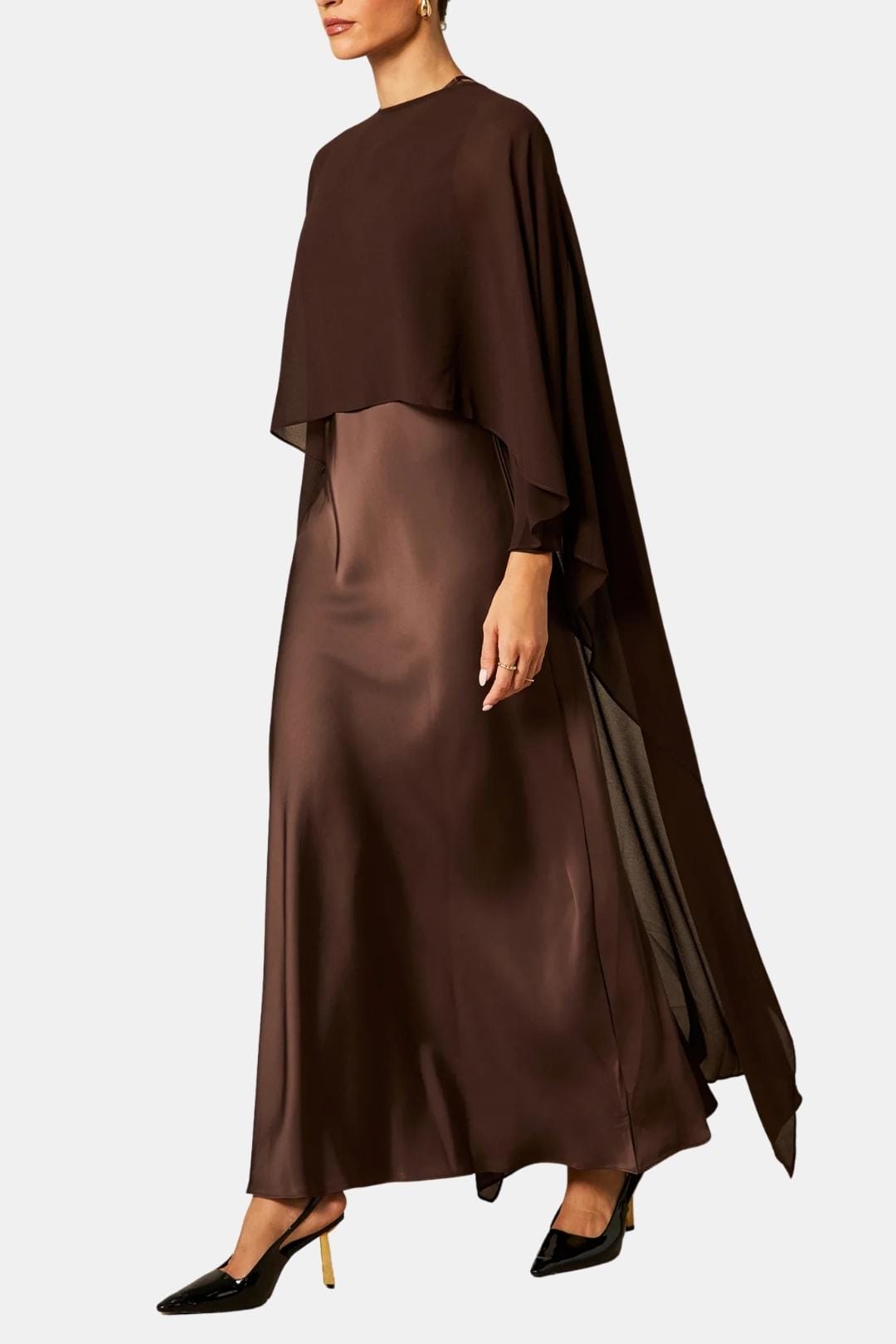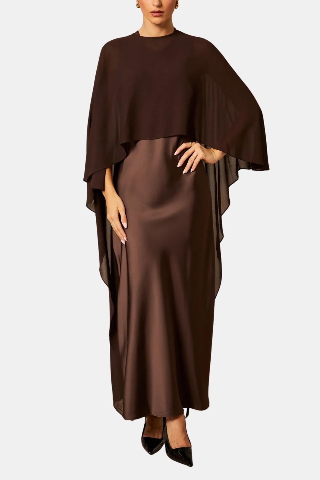 The Eris Maxi Dress is a refined statement piece designed for elegant occasions. Featuring a smooth satin base with a softly draped cape overlay, this silhouette offers graceful movement and modern modesty. The clean crew neckline and fluid maxi length create a timeless look that transitions effortlessly from weddings to evening events.