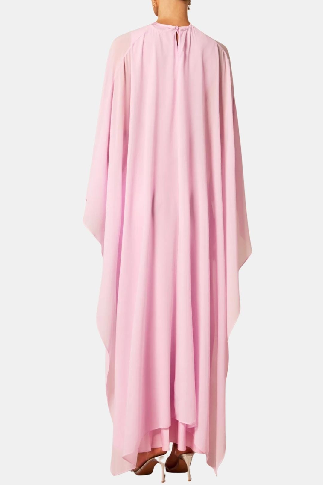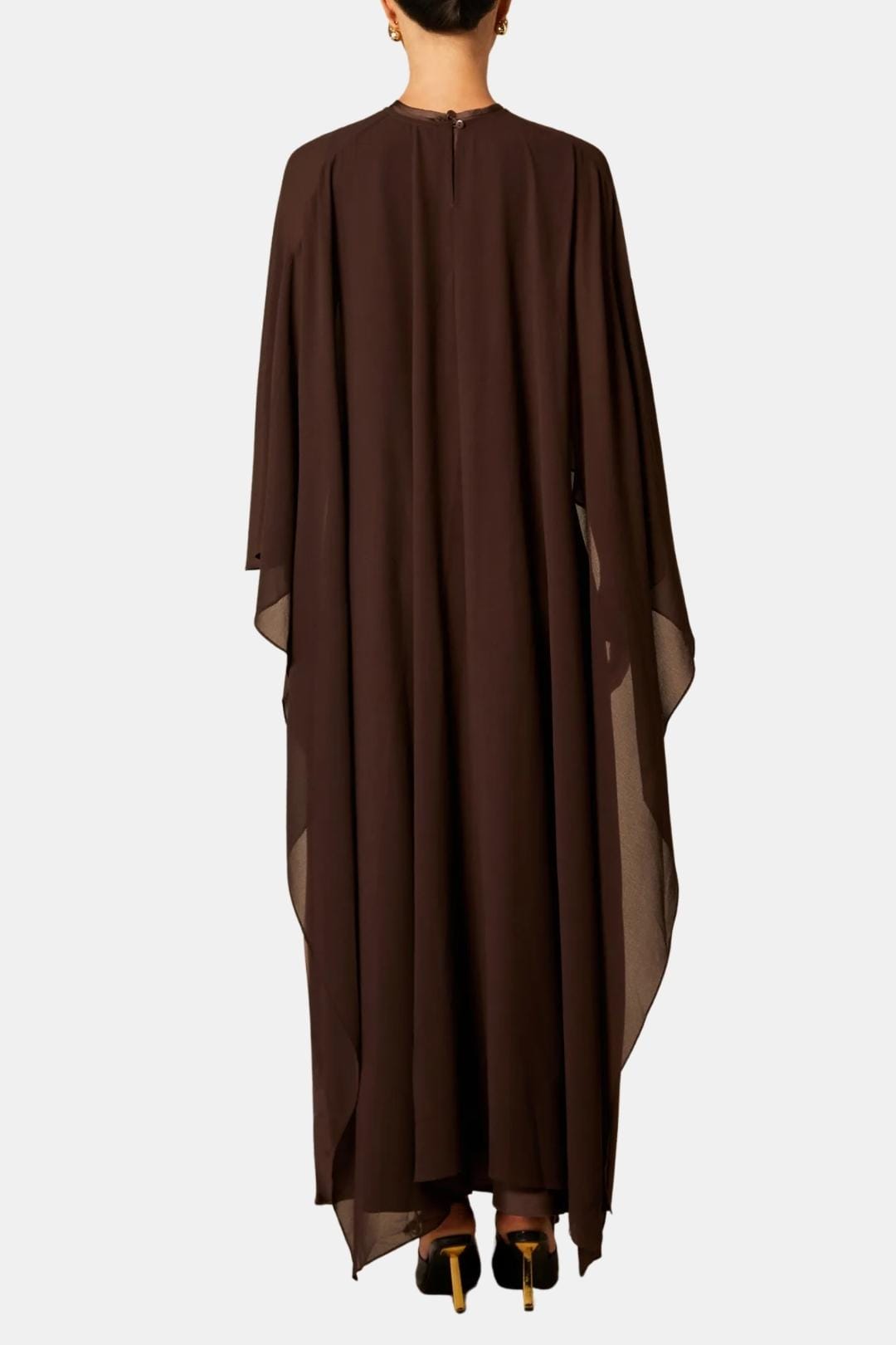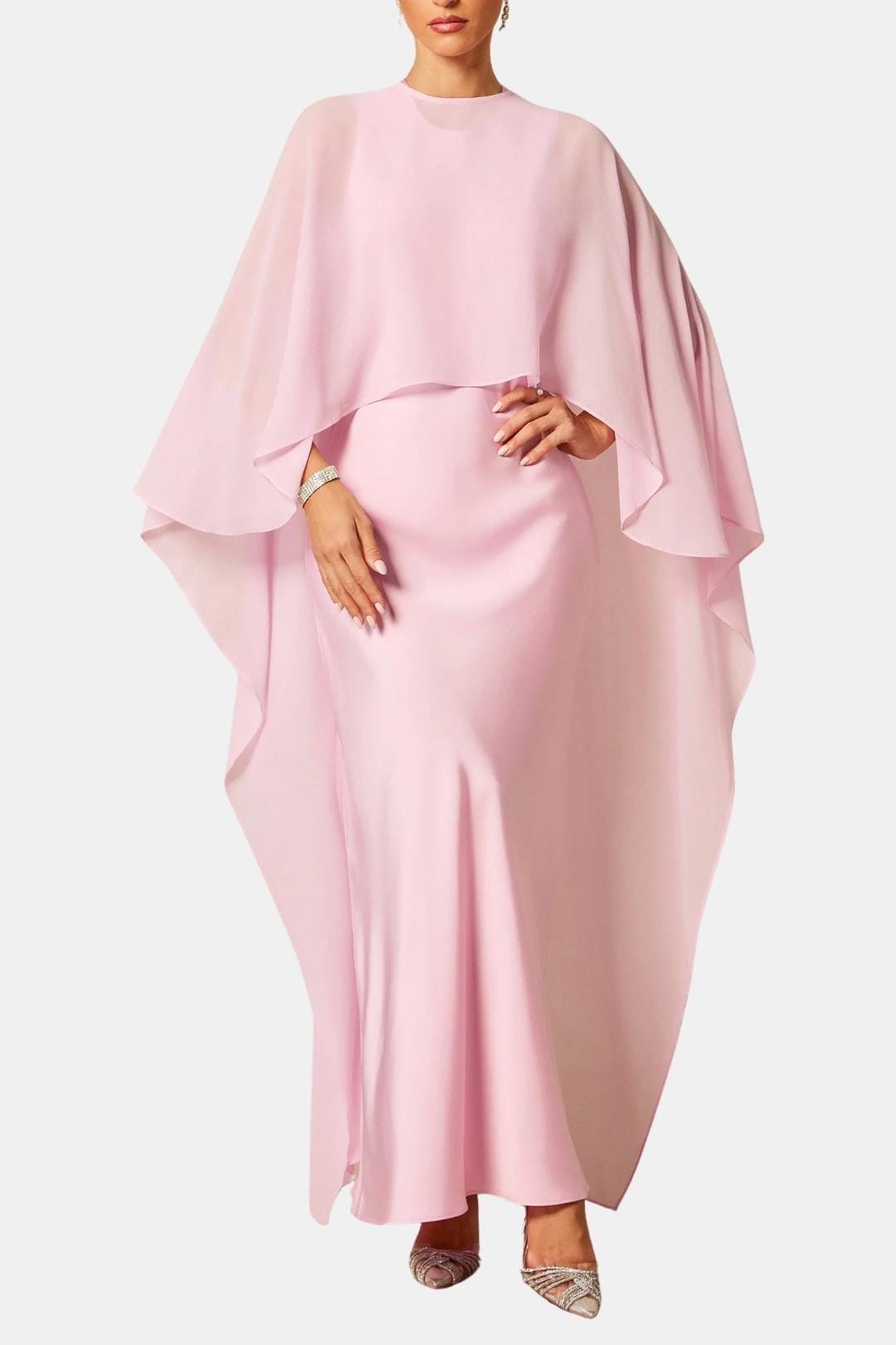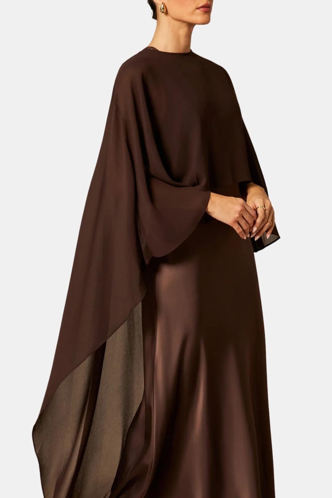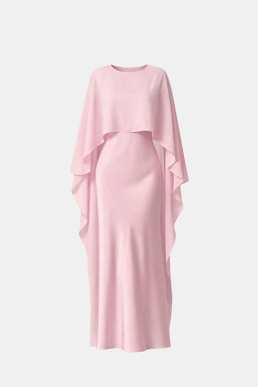 The Eris Maxi Dress is a refined statement piece designed for elegant occasions. Featuring a smooth satin base with a softly draped cape overlay, this silhouette offers graceful movement and modern modesty. The clean crew neckline and fluid maxi length create a timeless look that transitions effortlessly from weddings to evening events.