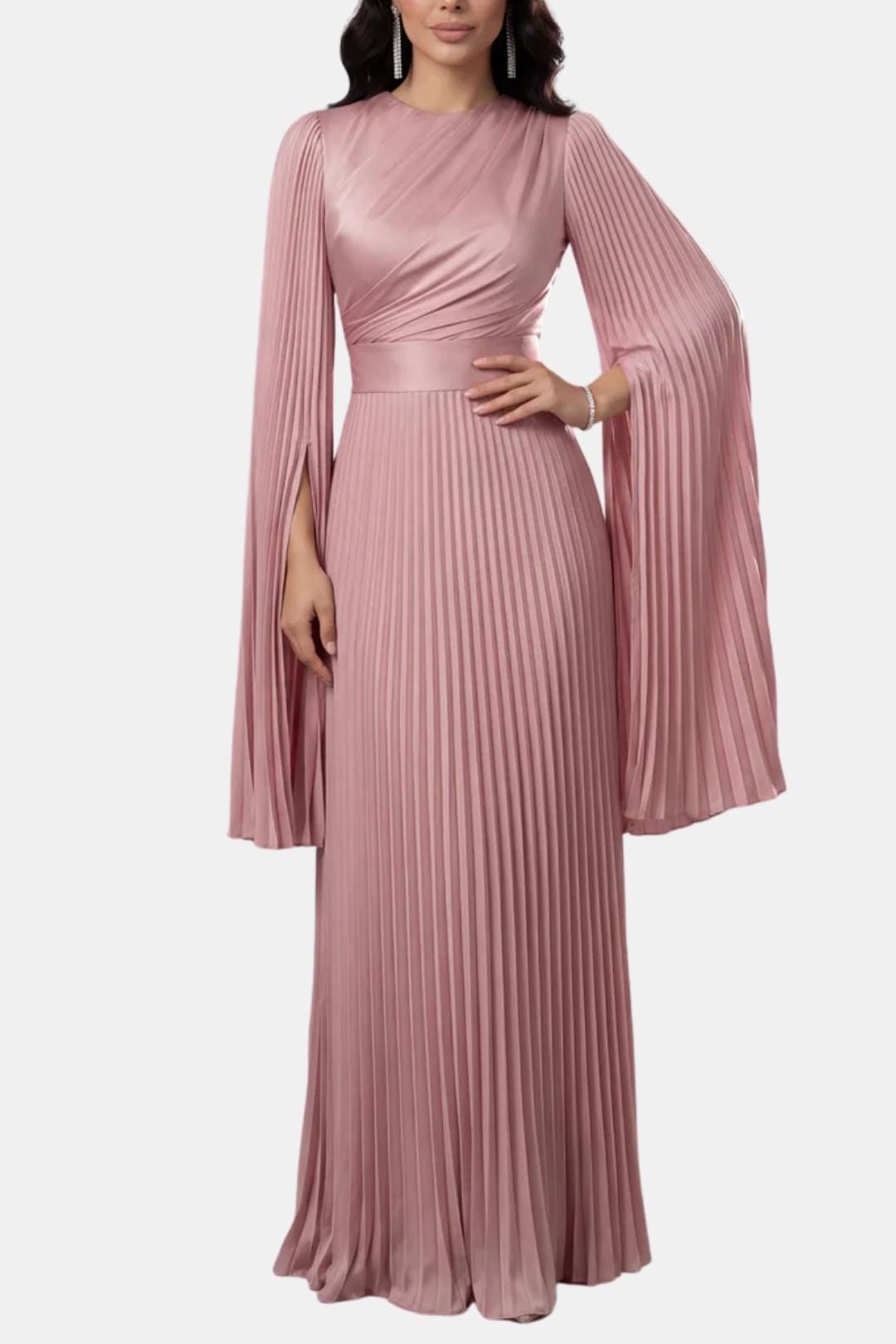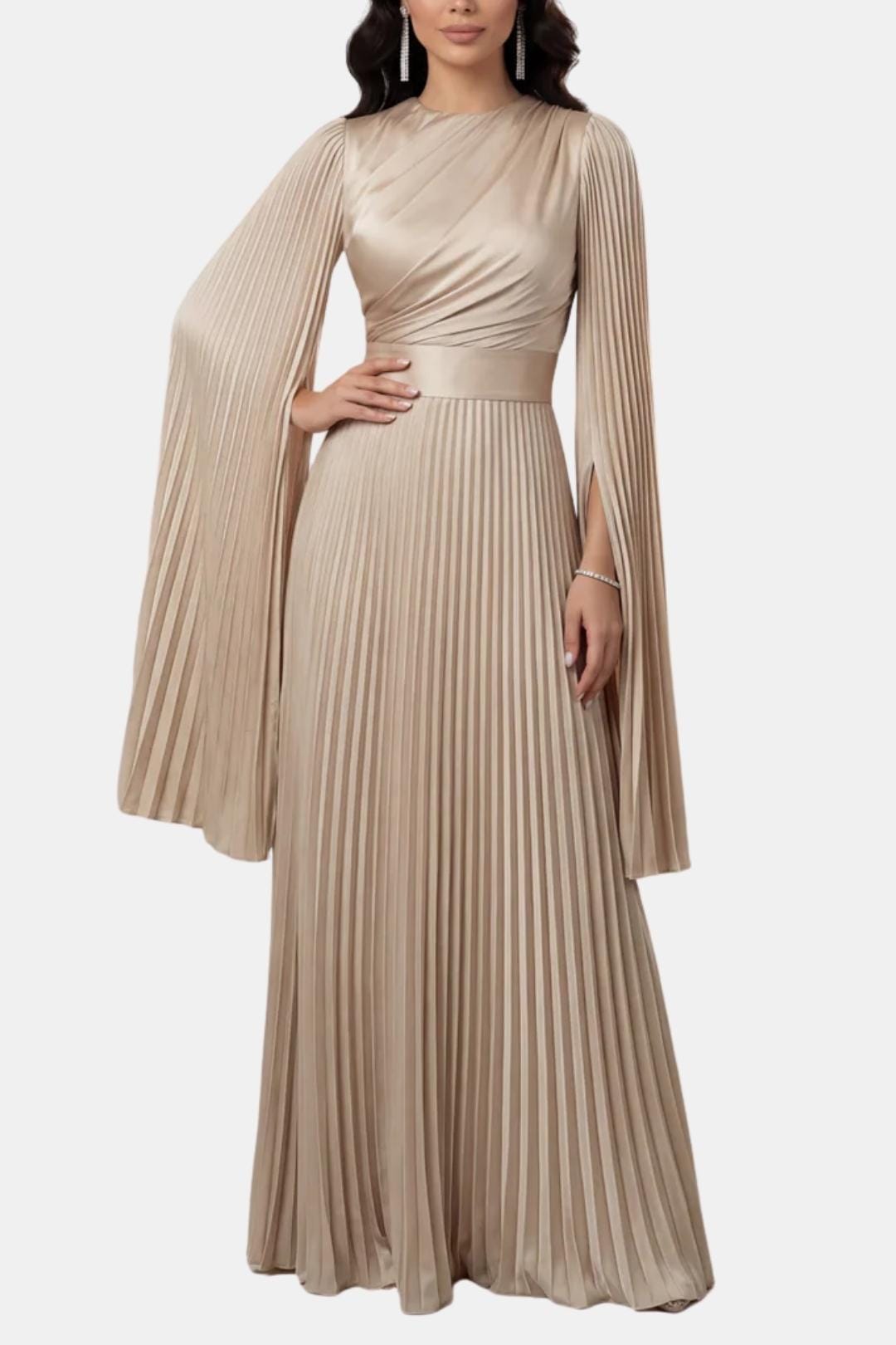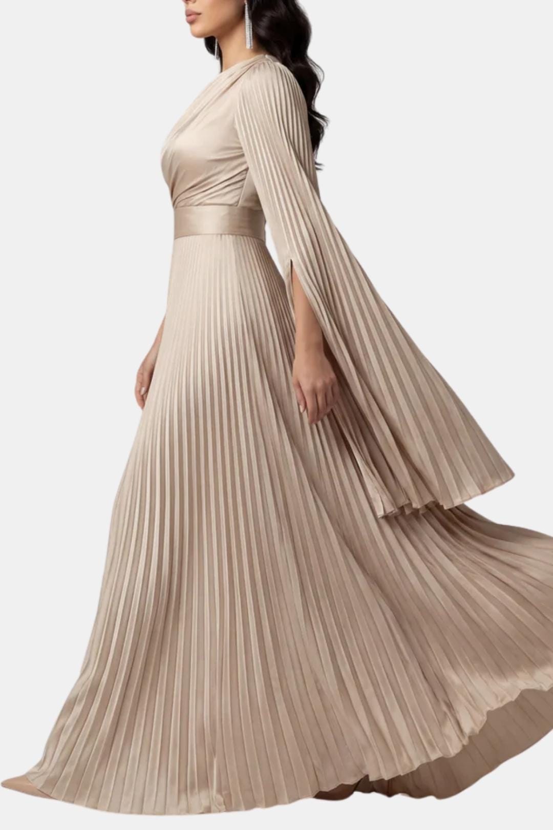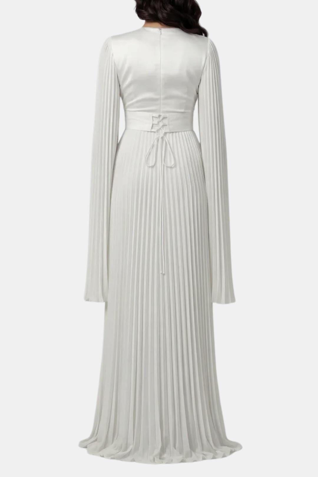 Designed for elegant occasions, the Aurelie Gown is crafted from lustrous pleated satin that moves fluidly with every step. The refined drape, sculpted waist and flowing split sleeves create a graceful silhouette that balances modern elegance with timeless modesty. Perfect for weddings, formal evenings and special celebrations where understated luxury takes centre stage.