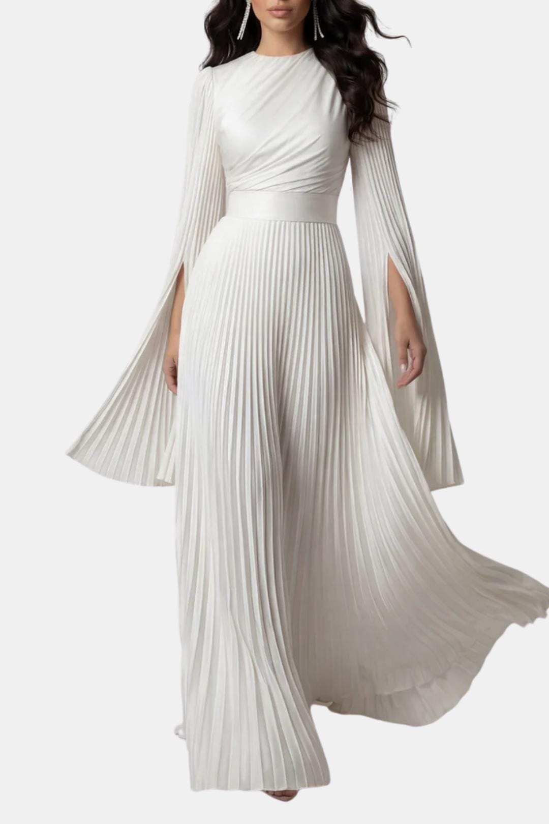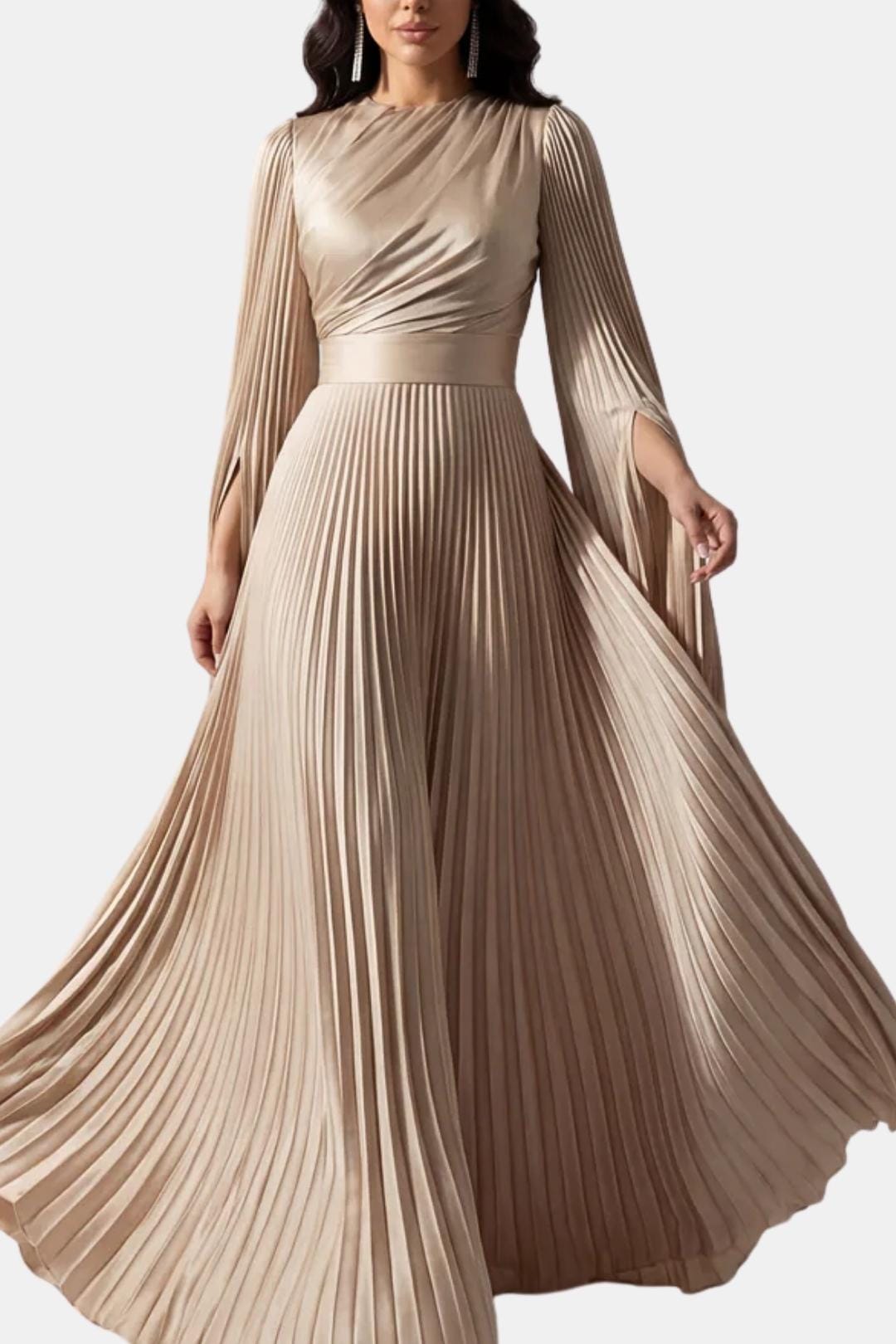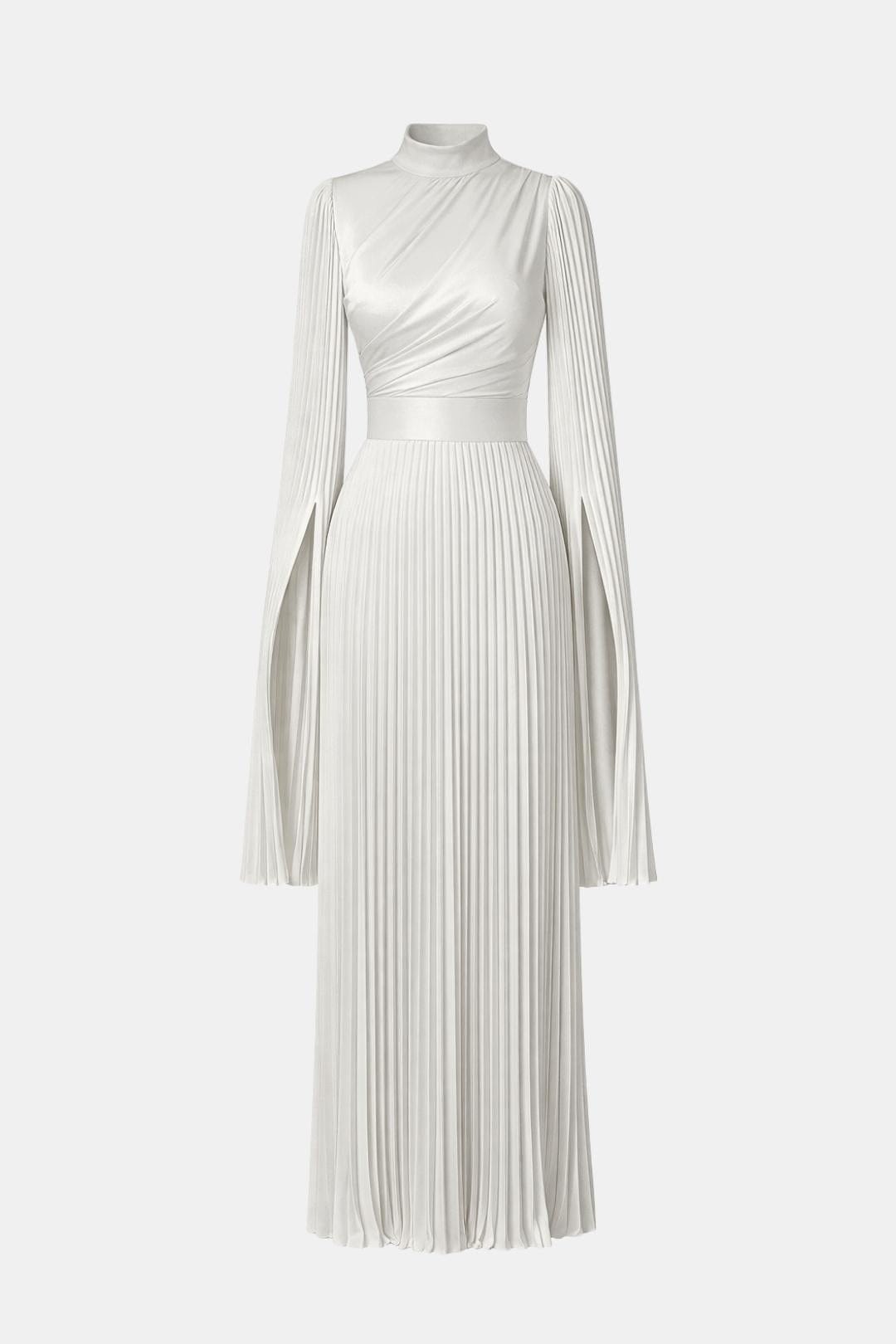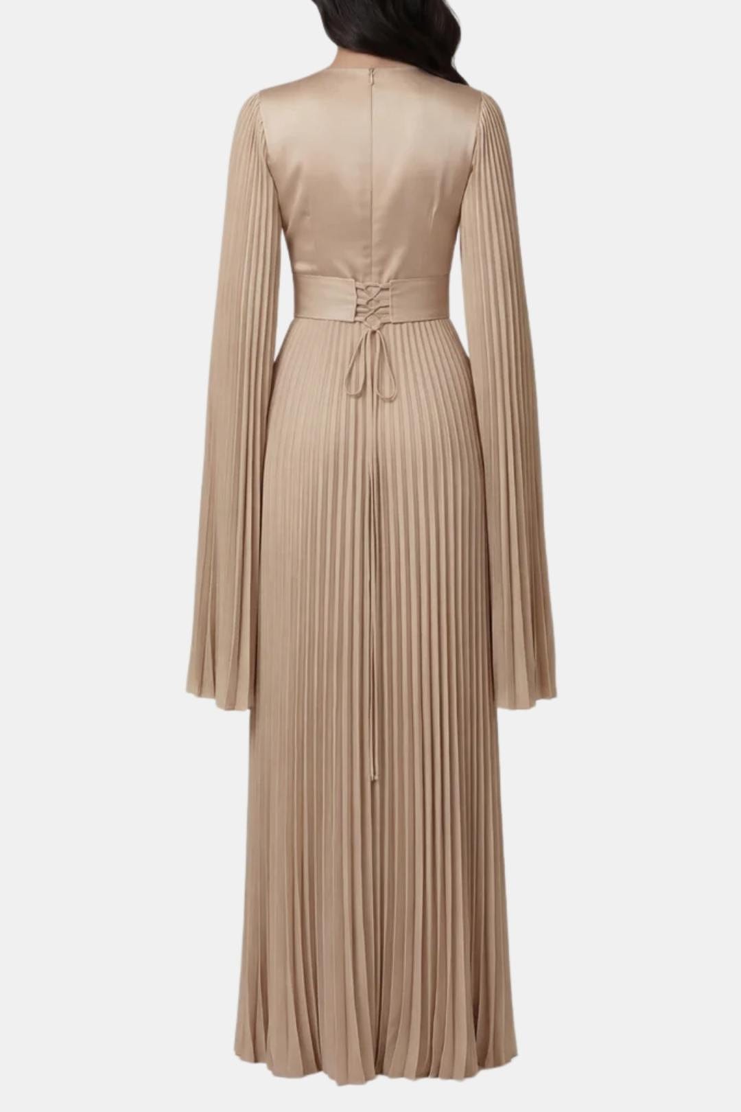 Designed for elegant occasions, the Aurelie Gown is crafted from lustrous pleated satin that moves fluidly with every step. The refined drape, sculpted waist and flowing split sleeves create a graceful silhouette that balances modern elegance with timeless modesty. Perfect for weddings, formal evenings and special celebrations where understated luxury takes centre stage.
