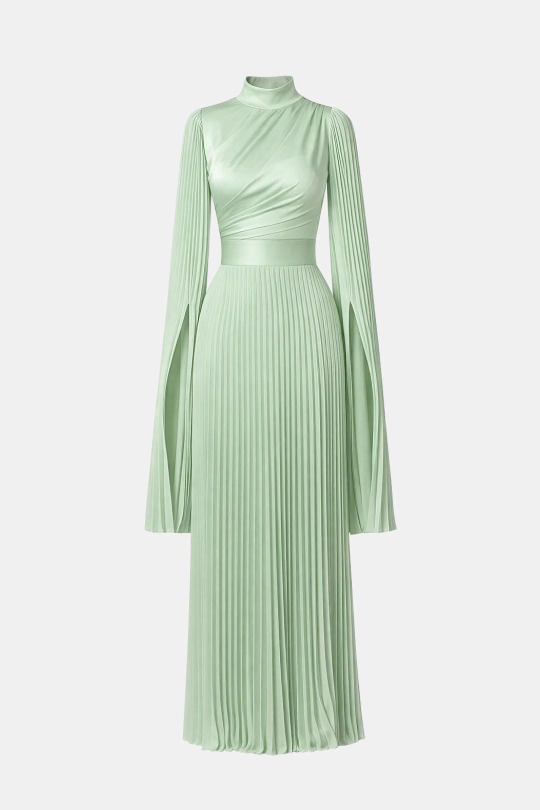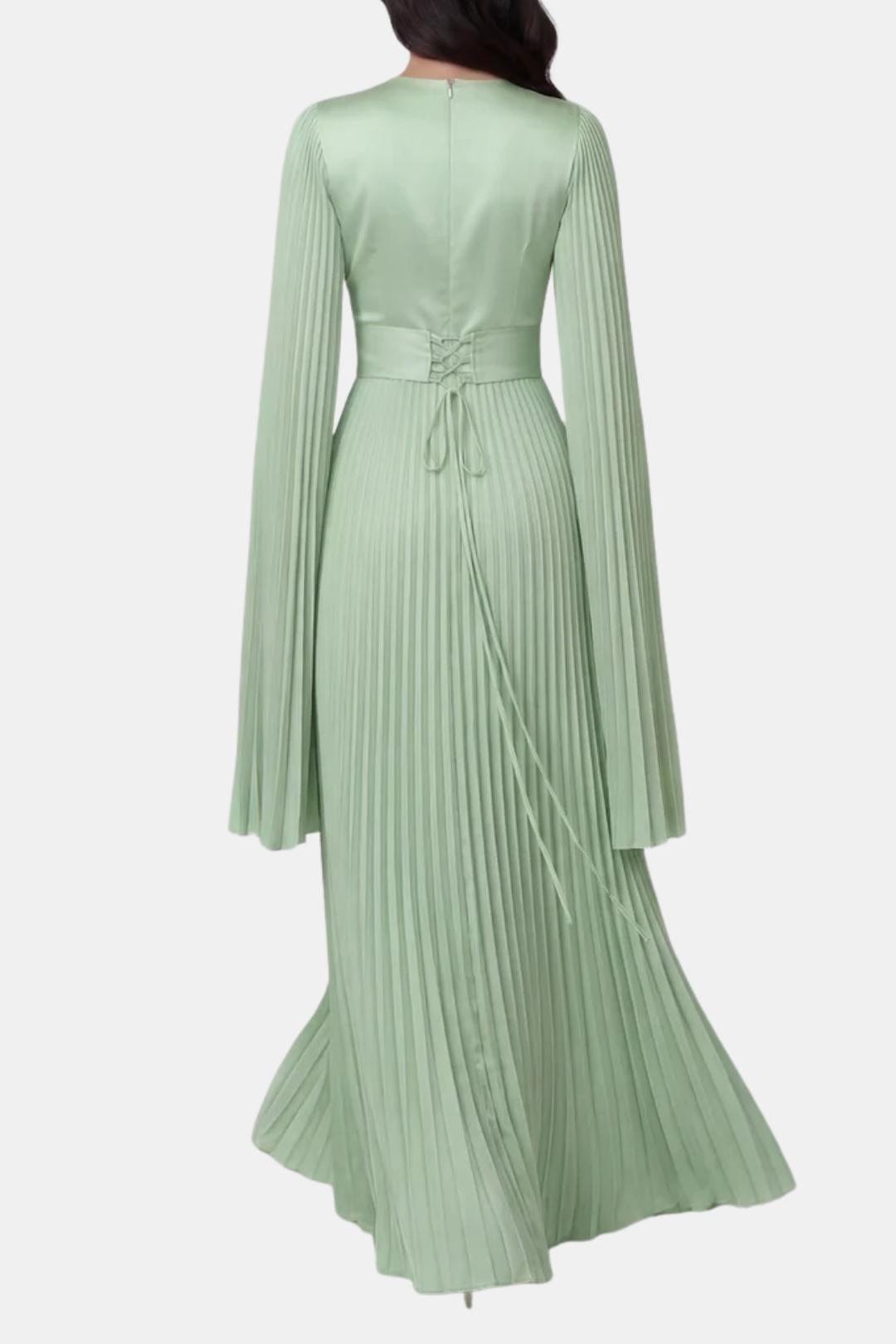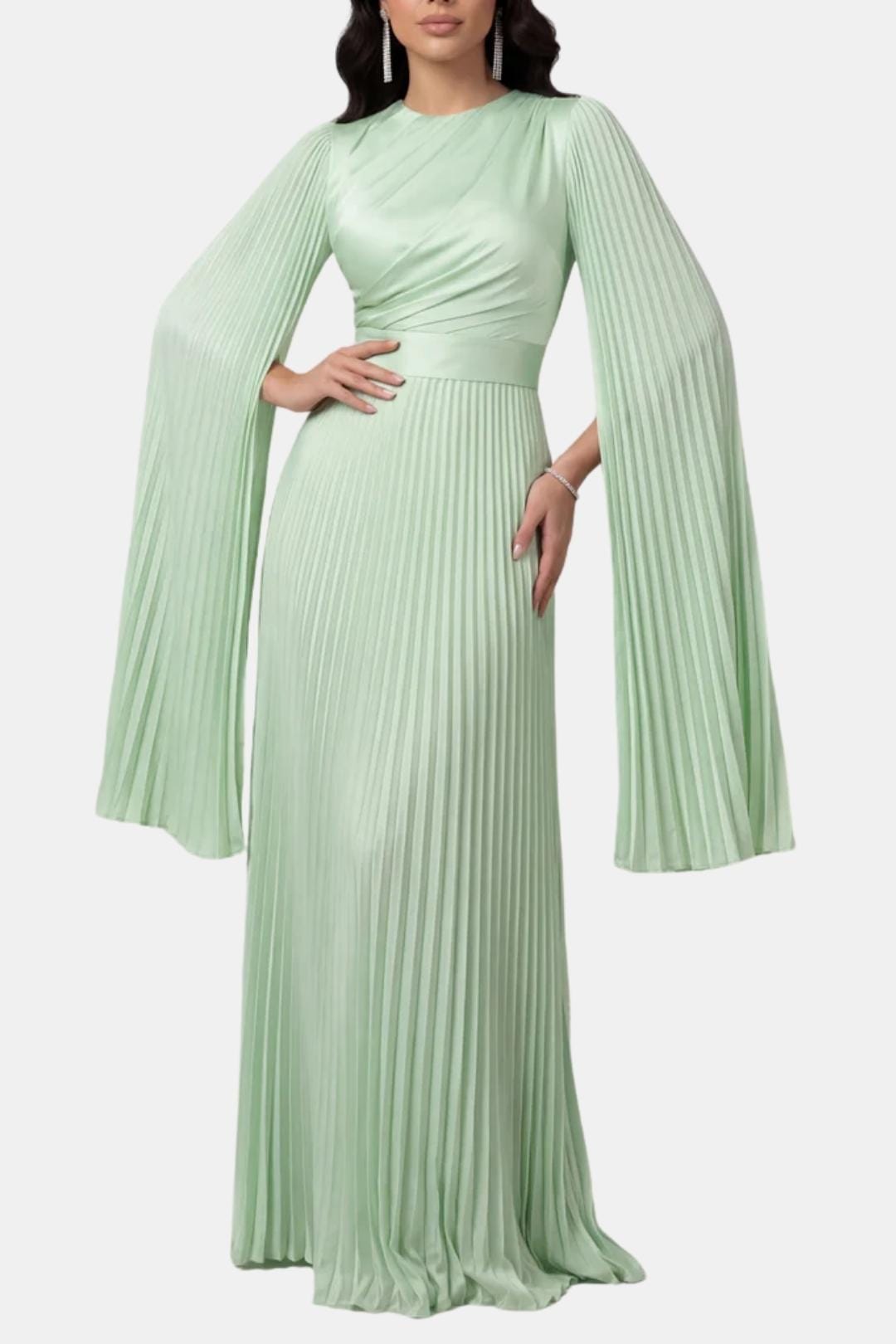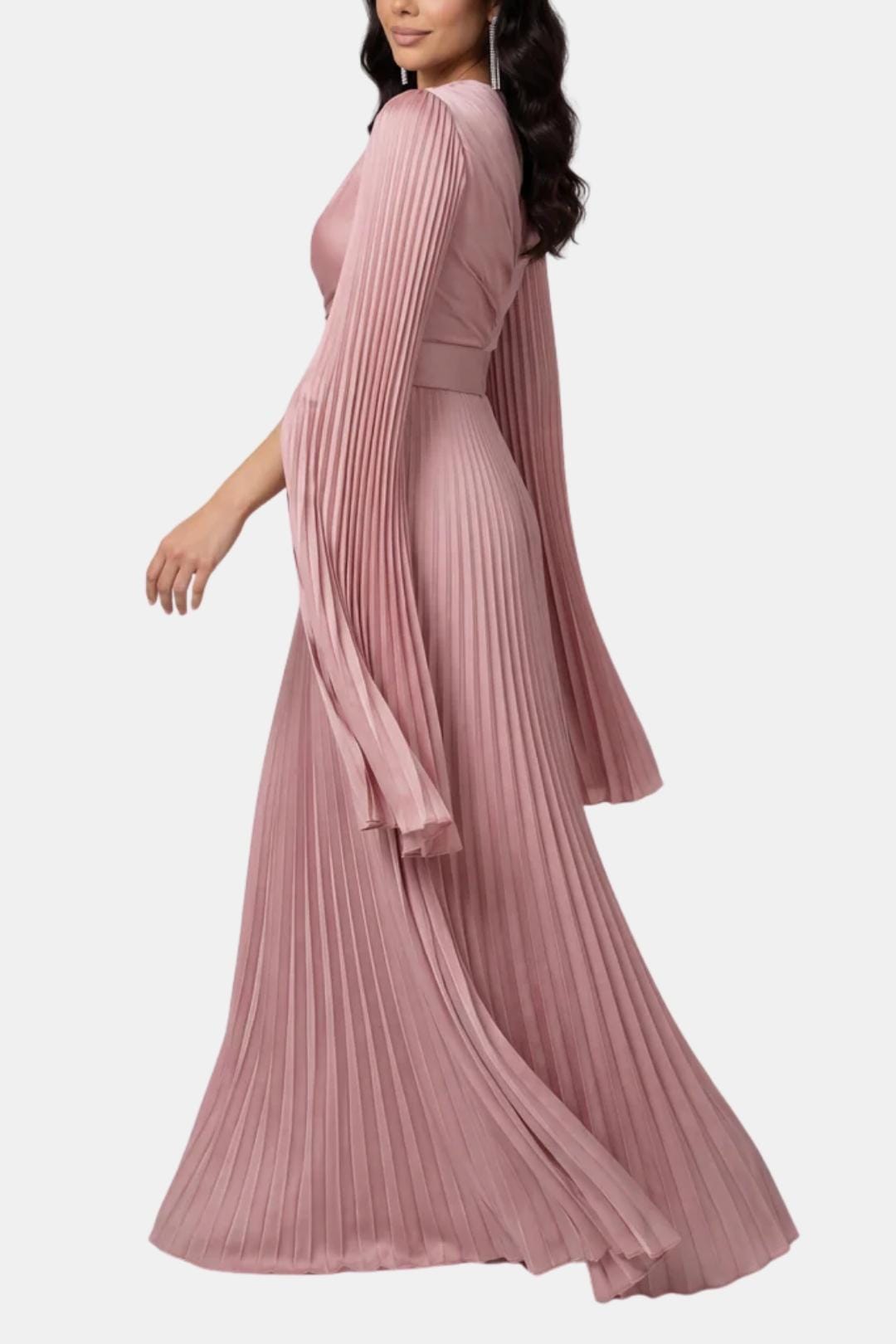 Designed for elegant occasions, the Aurelie Gown is crafted from lustrous pleated satin that moves fluidly with every step. The refined drape, sculpted waist and flowing split sleeves create a graceful silhouette that balances modern elegance with timeless modesty. Perfect for weddings, formal evenings and special celebrations where understated luxury takes centre stage.