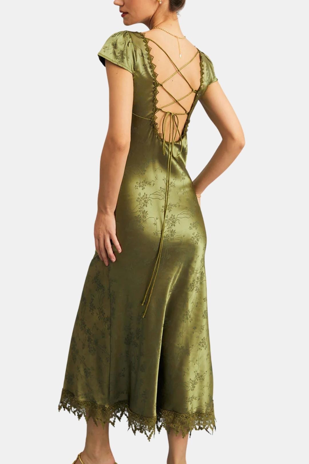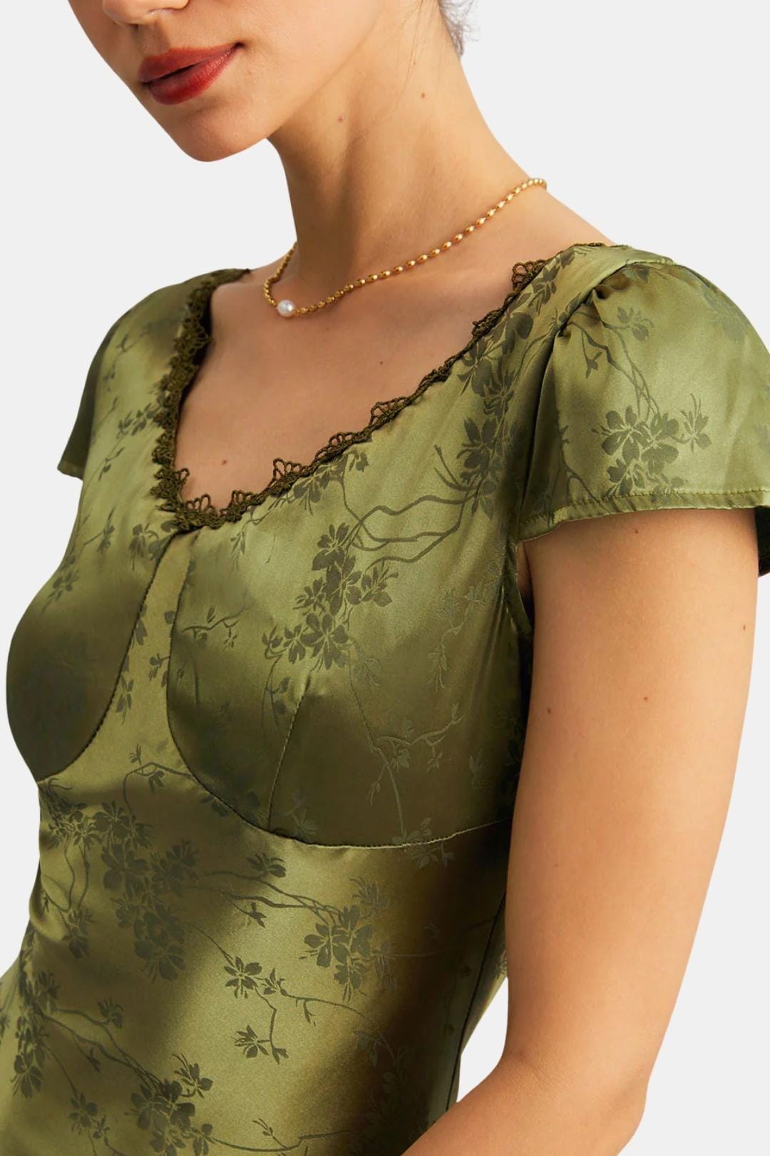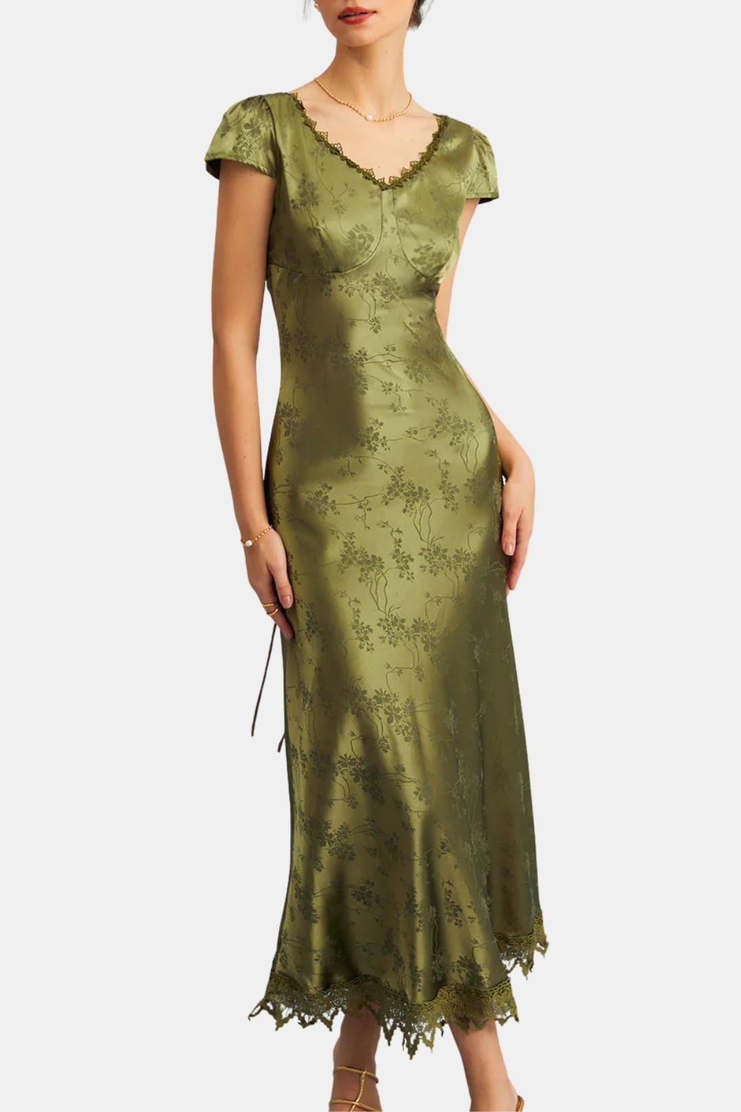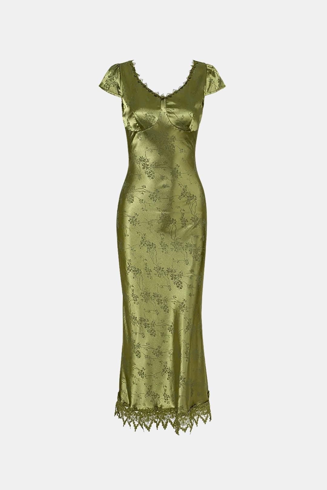 Magdalena – Green Jacquard Cap-Sleeve Satin Midi Dress