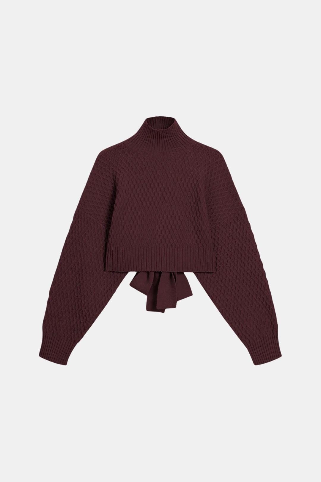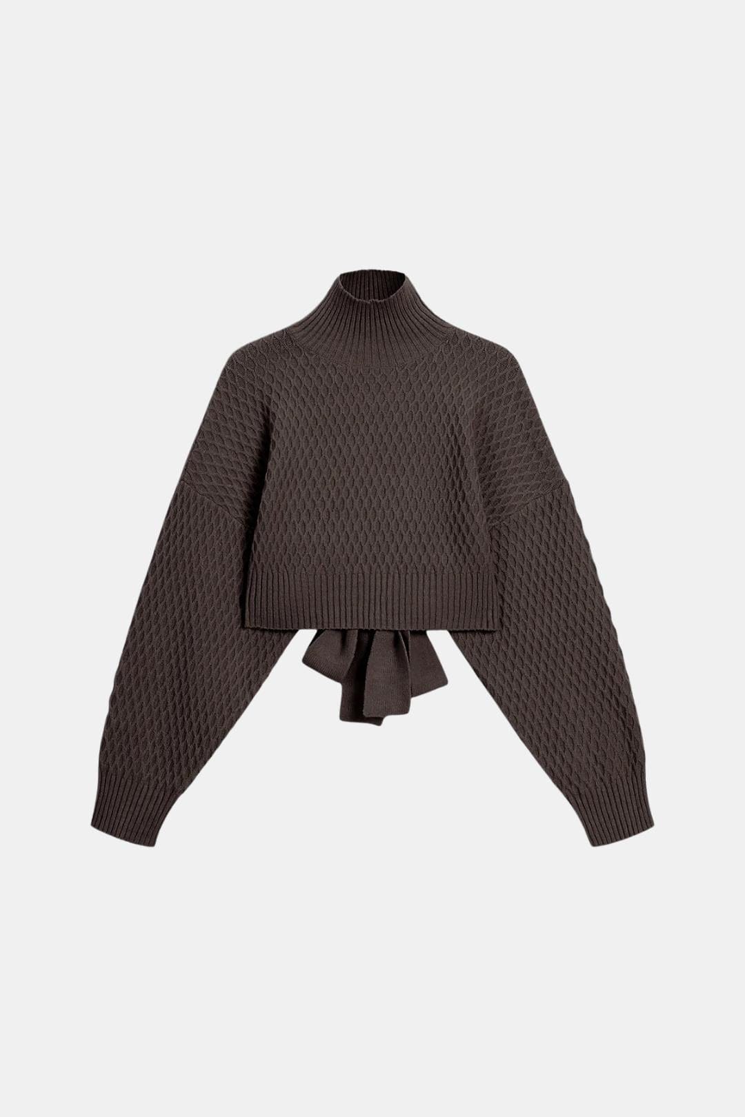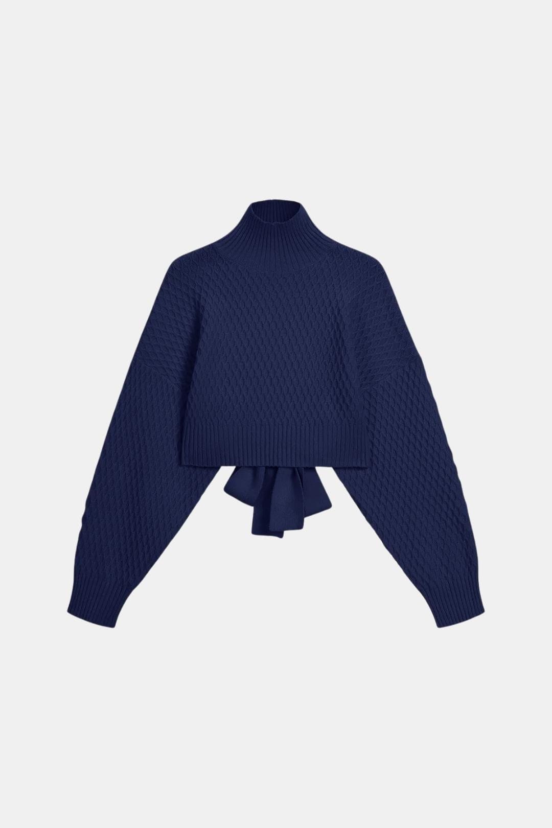 The Elianna – Open-Back Tie Knit Mock Neck Sweater is where elegance meets boldness. With its graceful open-back design tied into a soft bow and textured knit finish, it offers a perfect mix of femininity and modern sophistication.