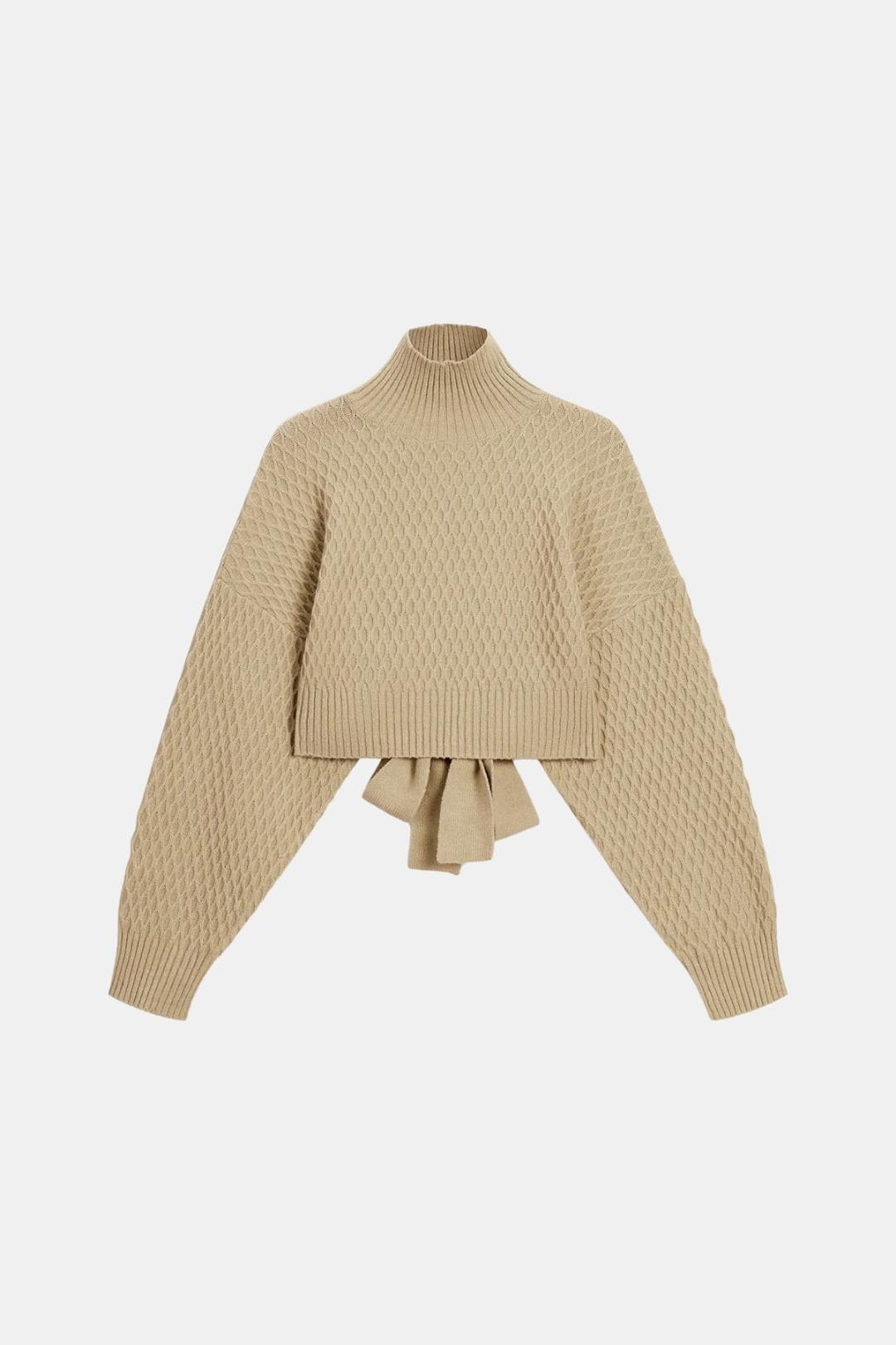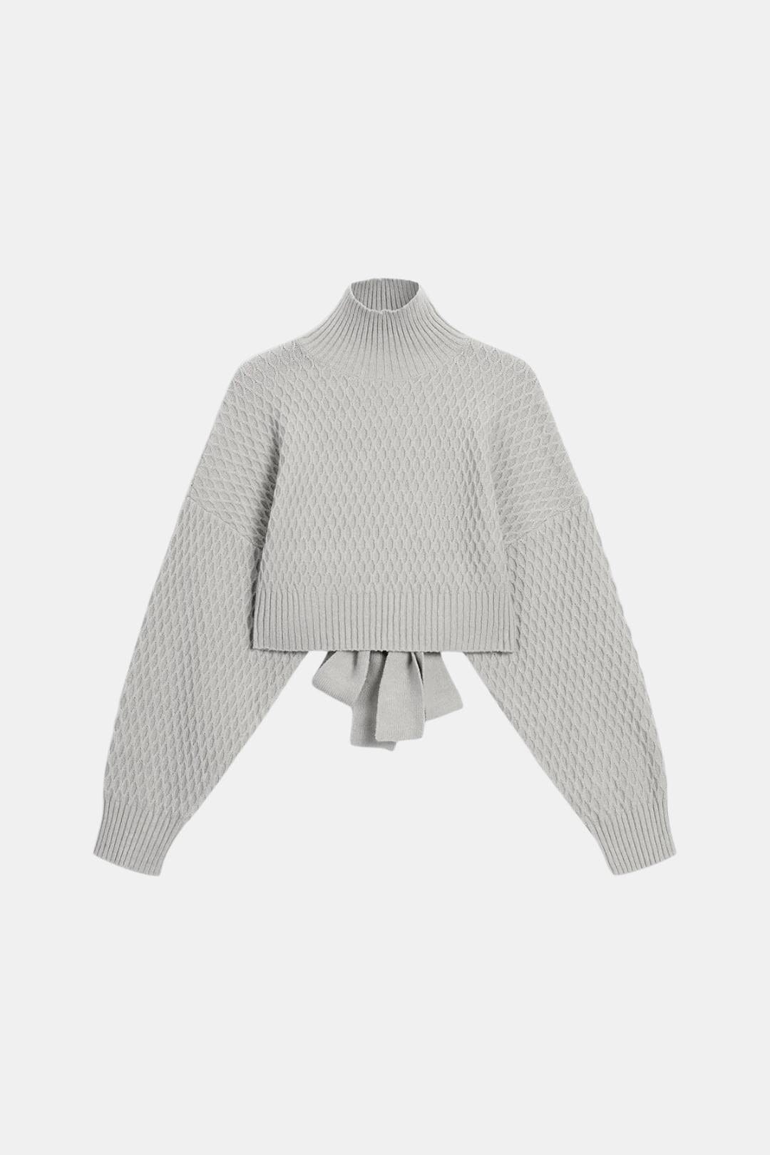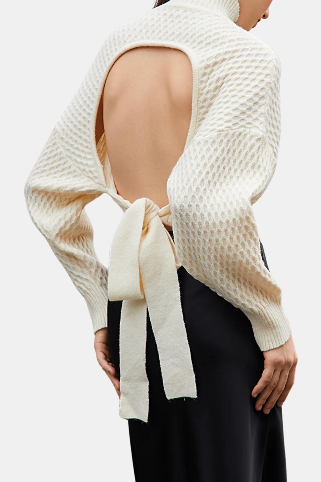 The Elianna – Open-Back Tie Knit Mock Neck Sweater is where elegance meets boldness. With its graceful open-back design tied into a soft bow and textured knit finish, it offers a perfect mix of femininity and modern sophistication.