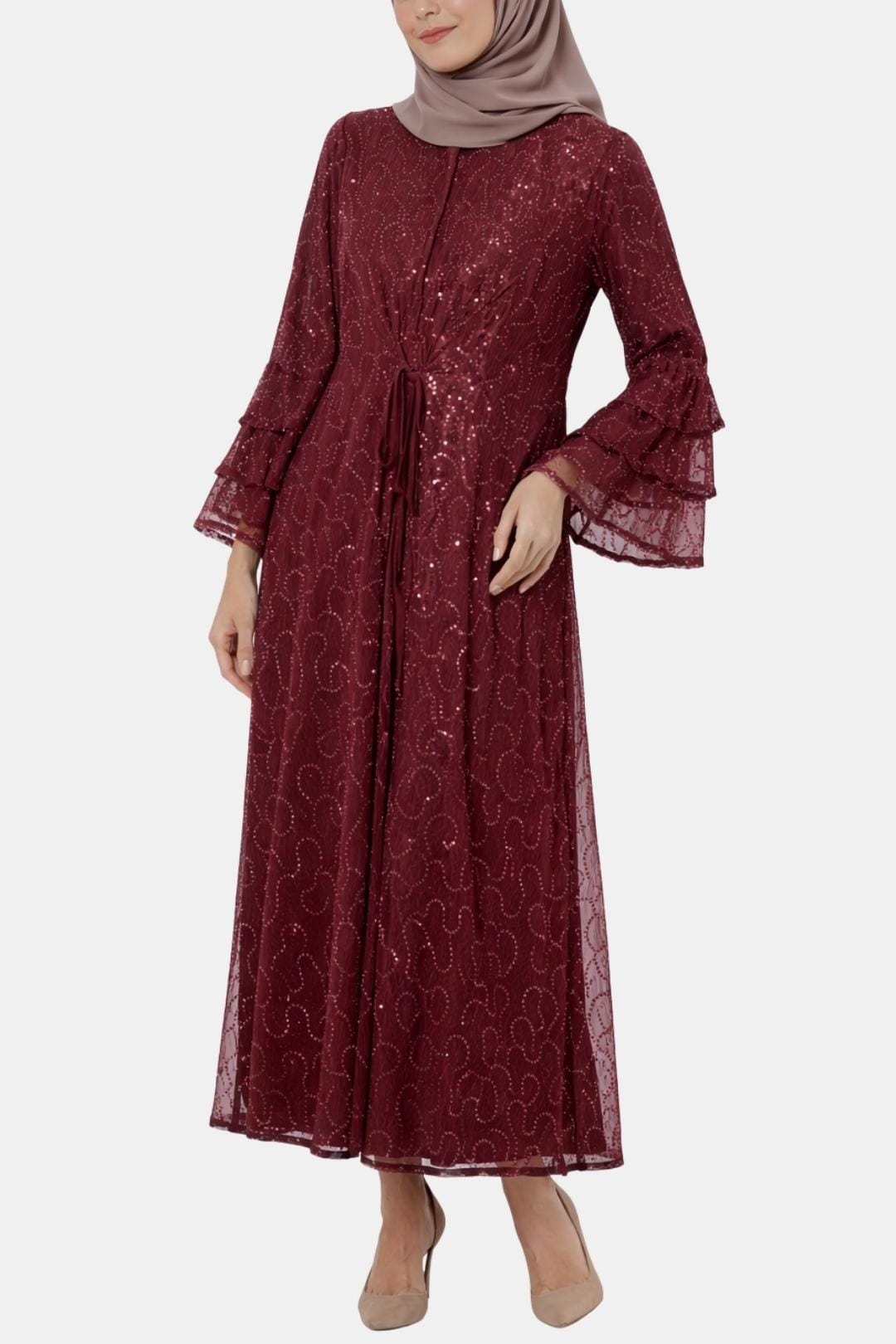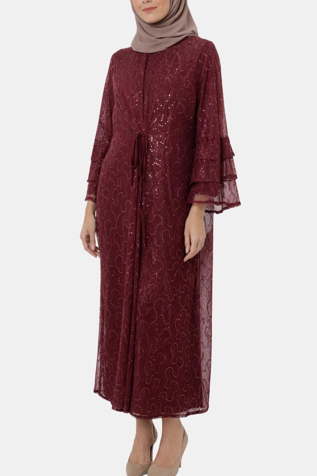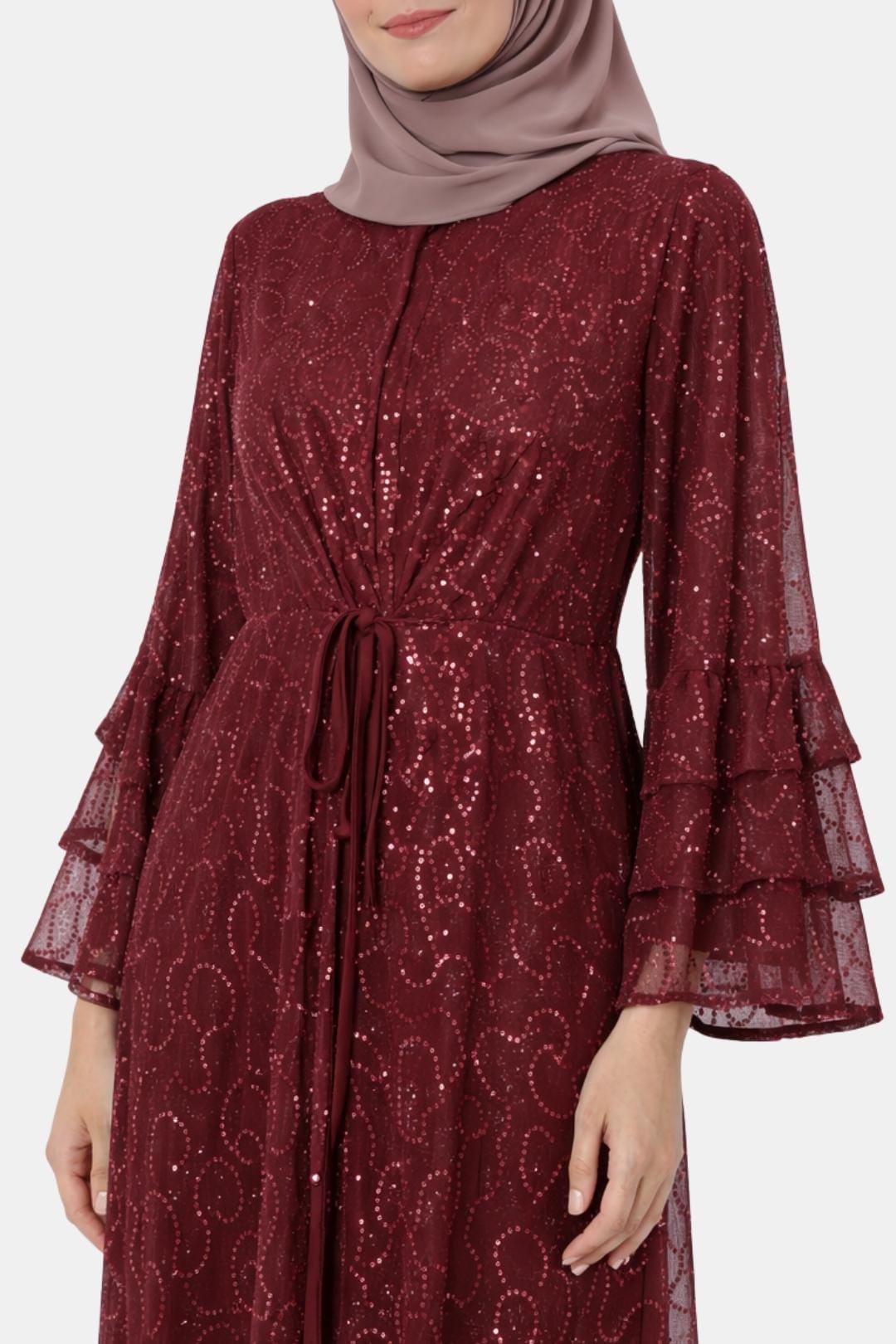 Lunessa – Sequin Lace Tie Waist Abaya in Raisin