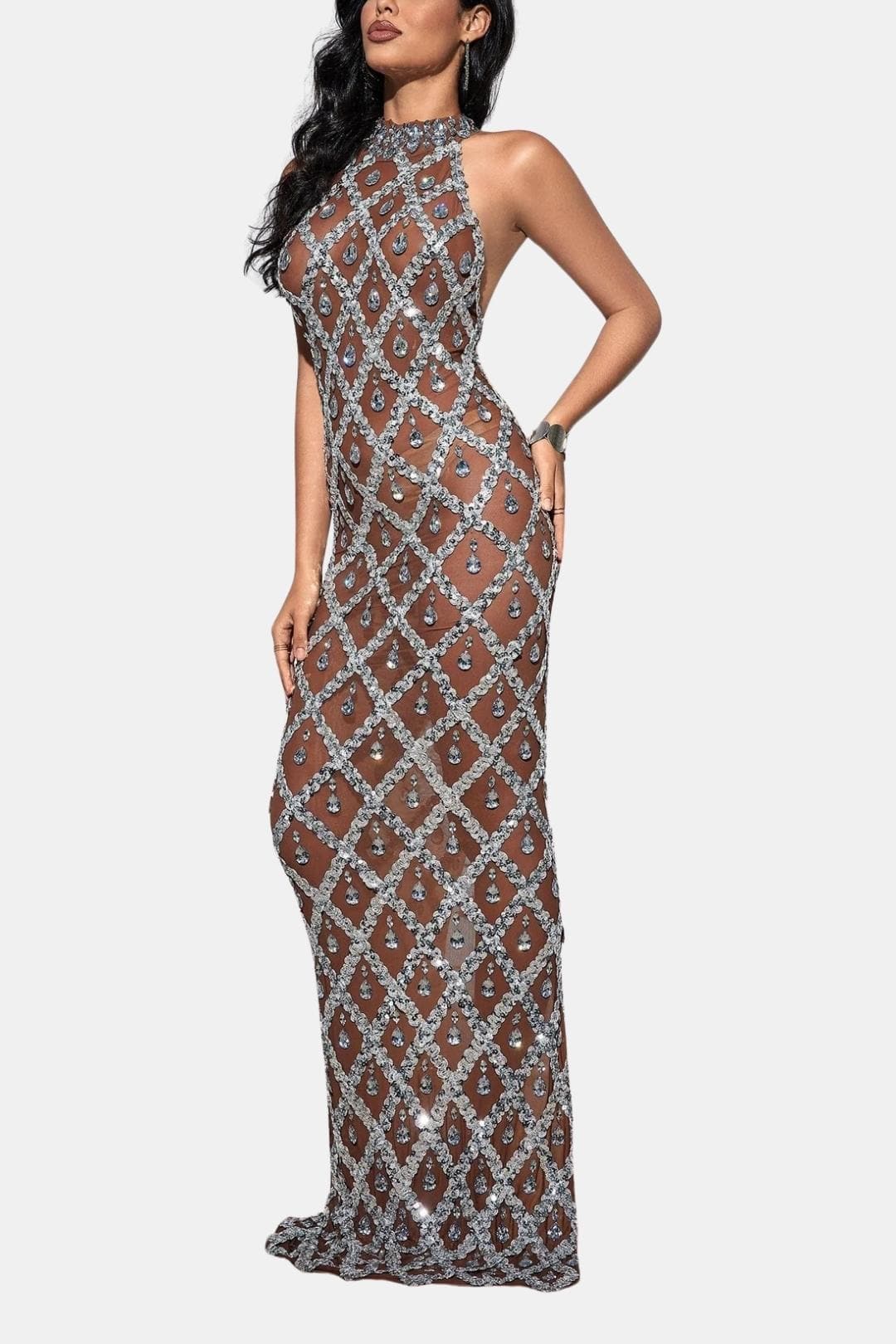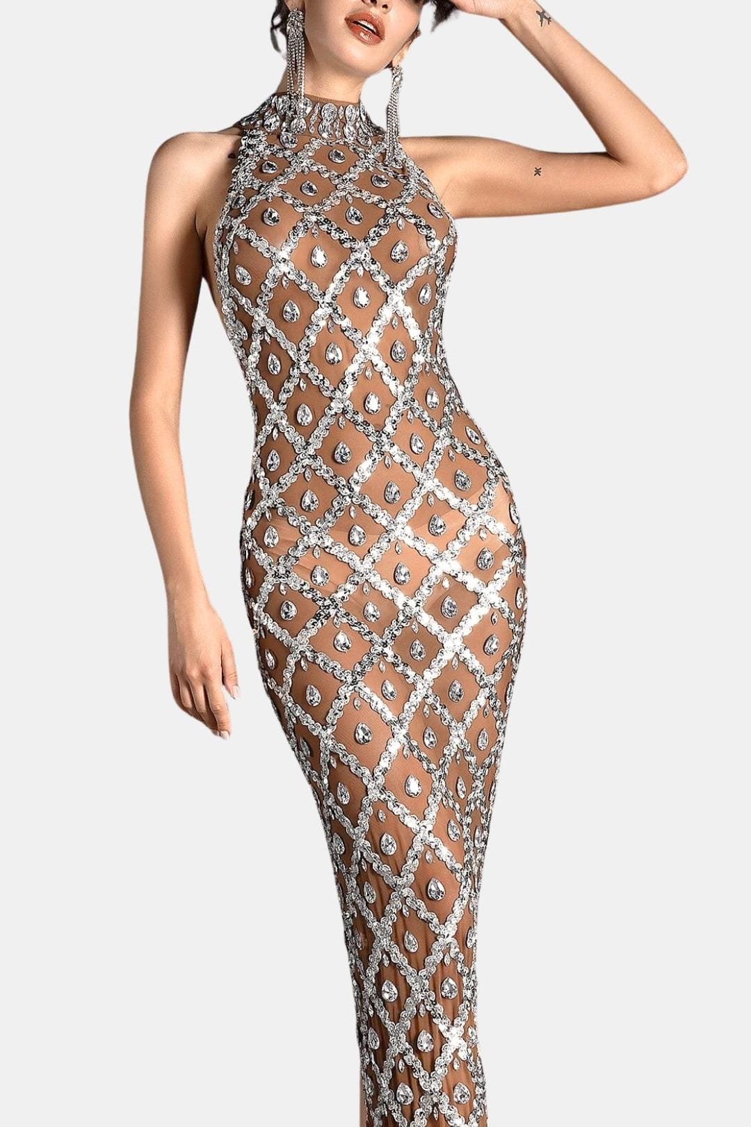 Meet Flora — a breathtaking maxi dress that blurs the line between elegance and allure. Designed with a sheer mesh base and intricate crystal embellishments, this statement silhouette creates a striking illusion while sculpting the body with precision and drama.