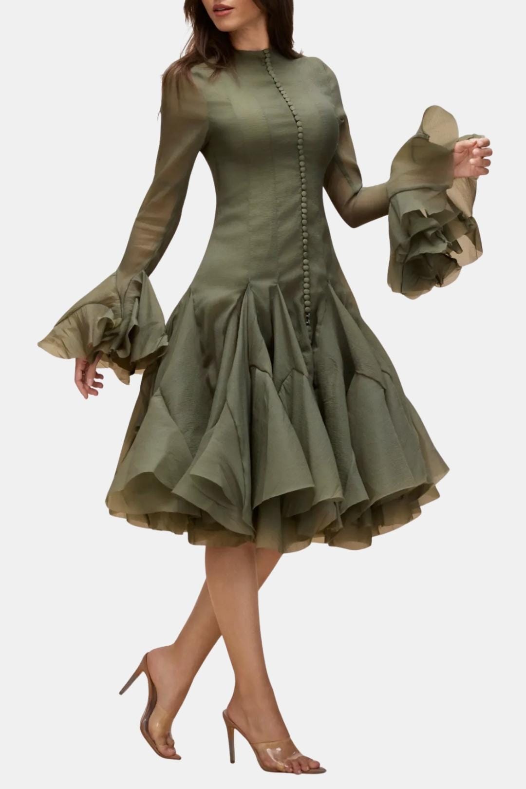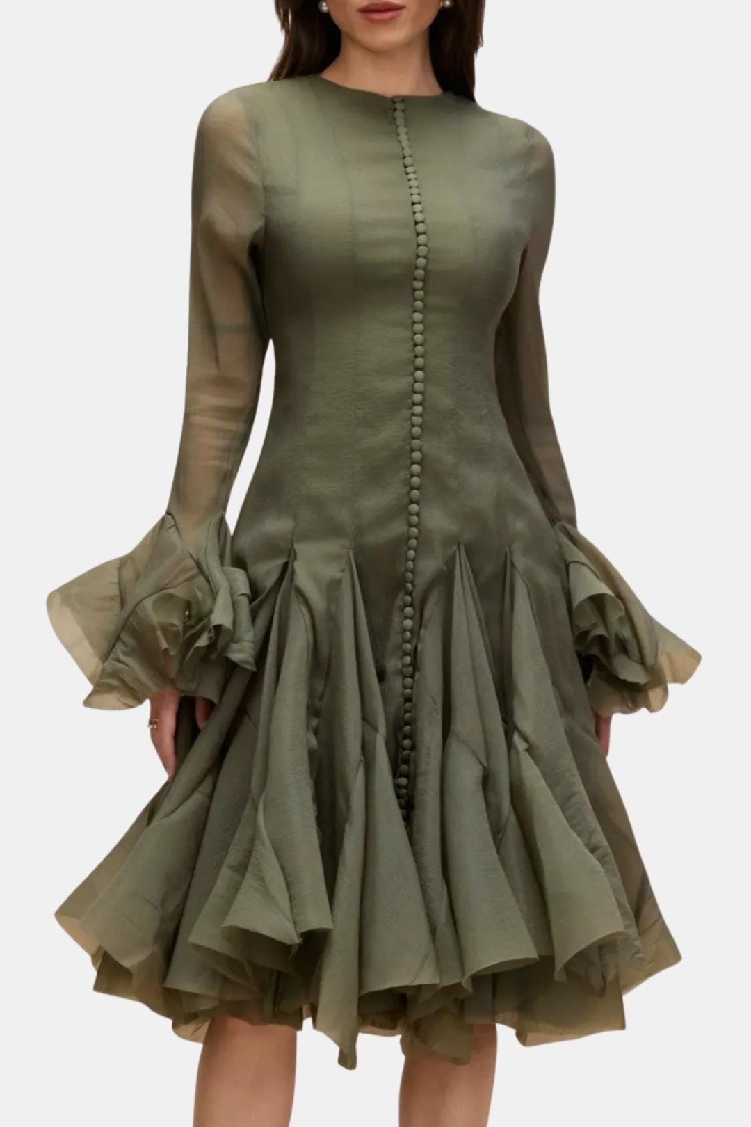 The Jimena – Long Sleeve Flared Hem Midi Dress offers a refined blend of sculpted tailoring and flowing movement. Its fitted bodice and dramatic cascading hem create a beautifully balanced silhouette suited for elevated moments.