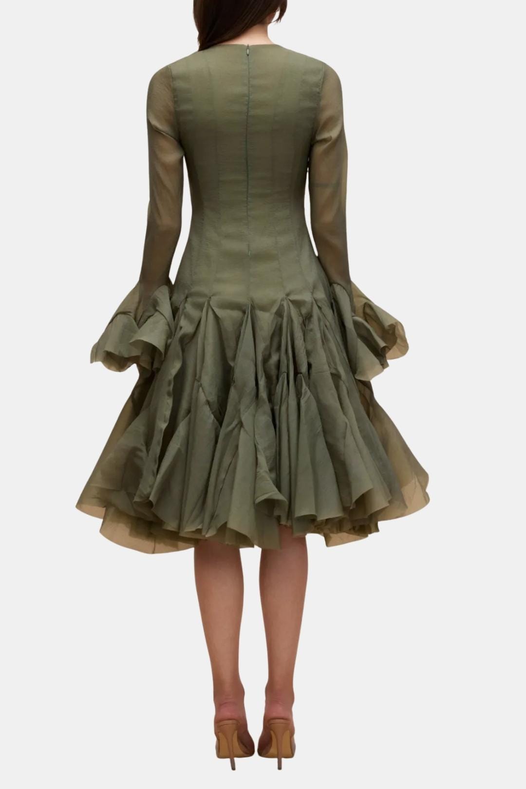 • Silhouette: Fitted bodice with layered, structured hem