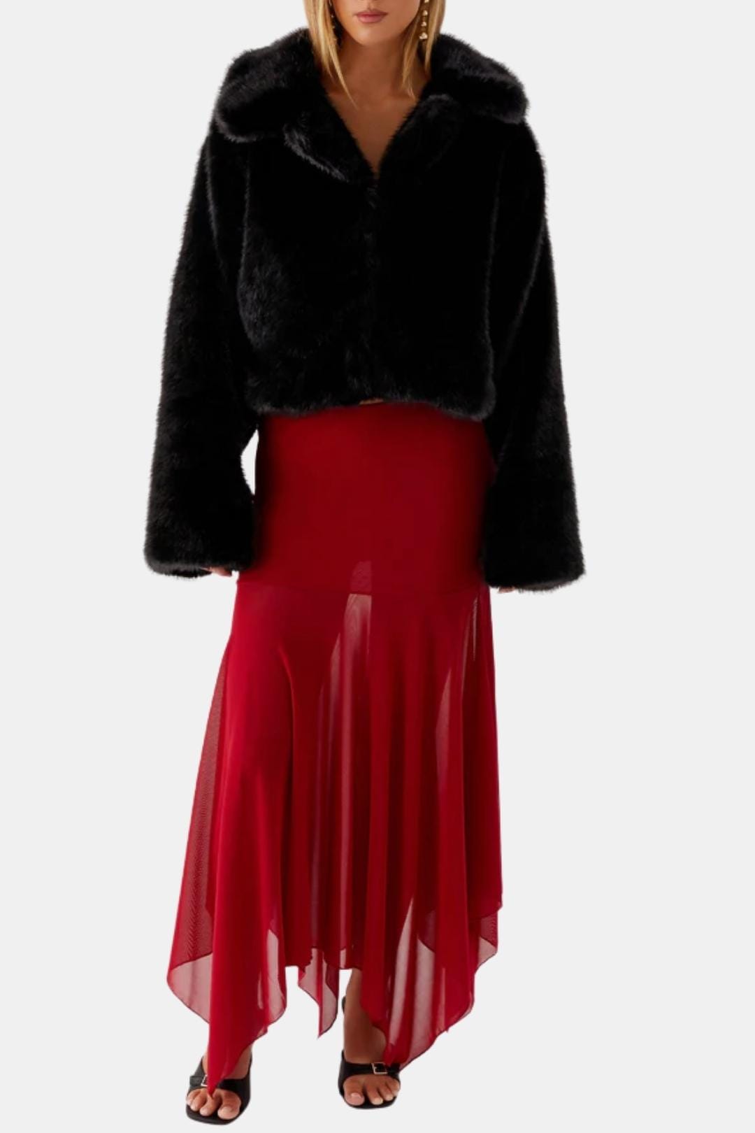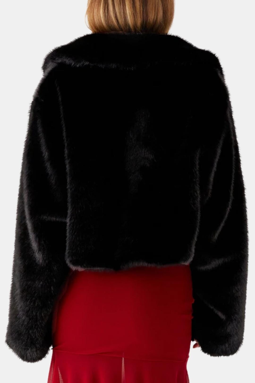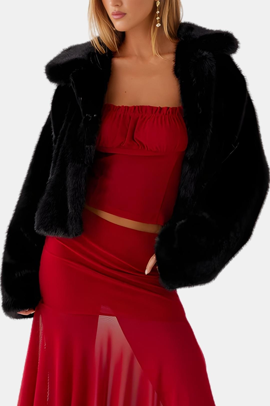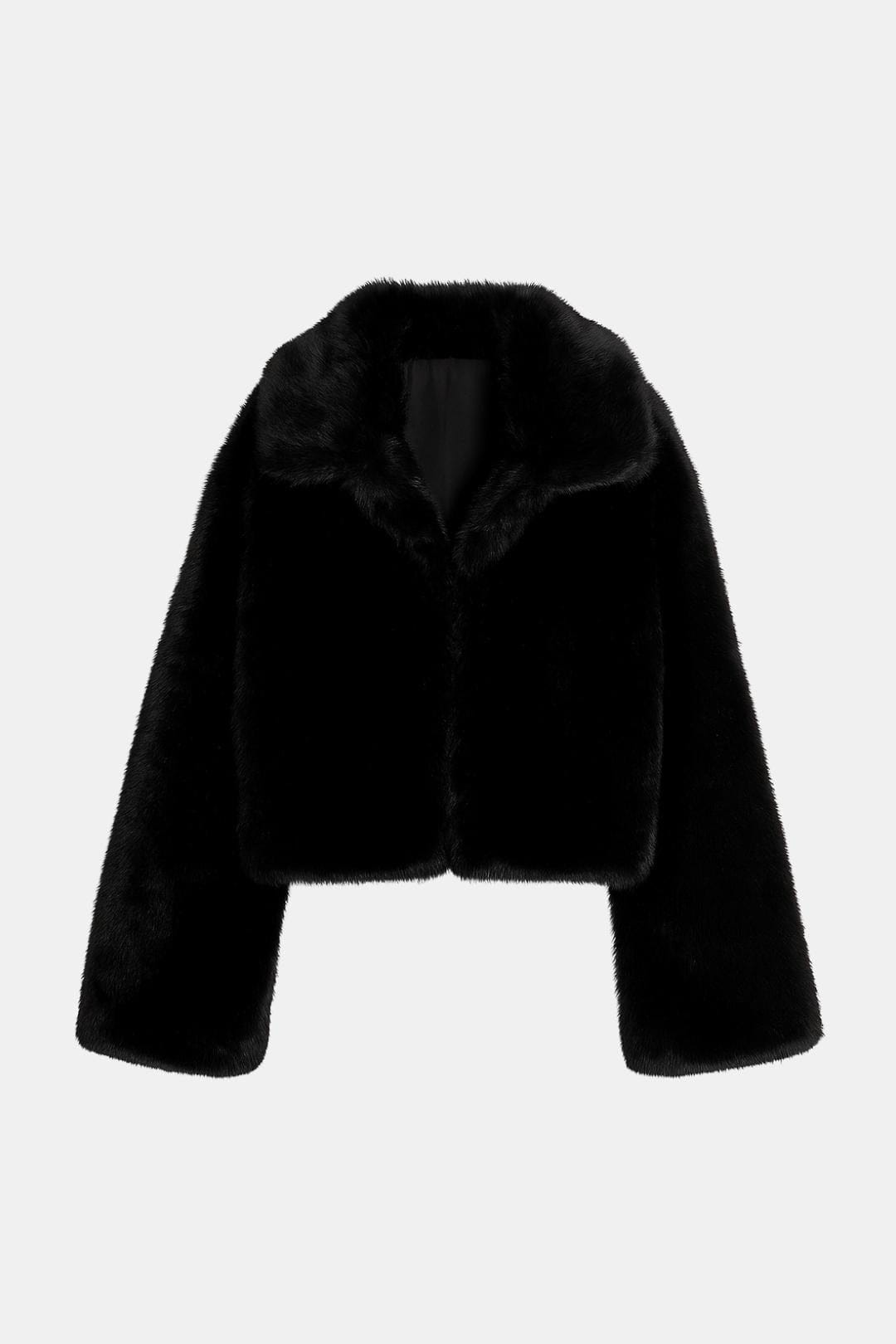 • Design: Cropped length, wide collar, long sleeves, and plush faux fur texture
