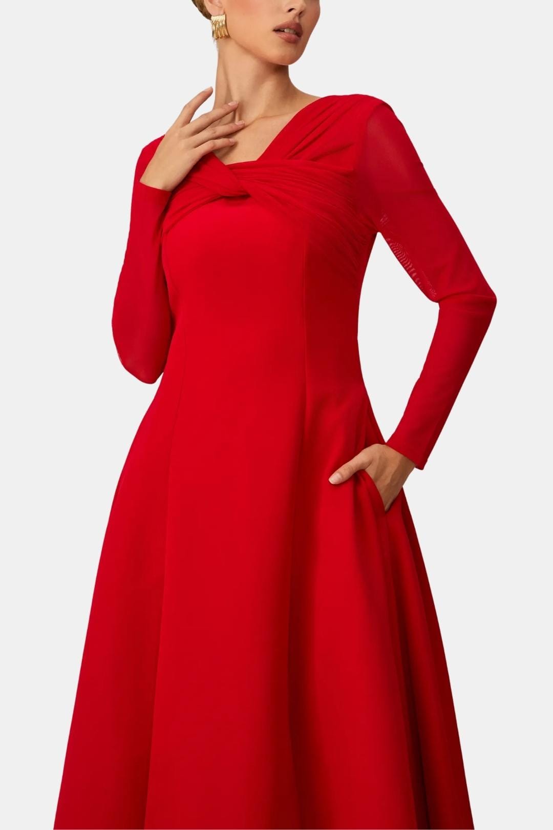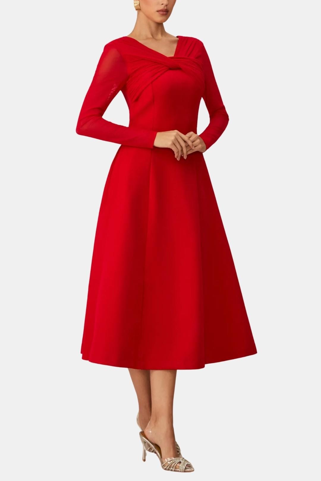 The Melynda Midi Dress is a striking Valentine’s Day style designed to flatter with a sculpted twist-front bodice and elegant A-line flow. This red midi dress offers timeless femininity with a refined silhouette, perfect for romantic evenings and special occasions.