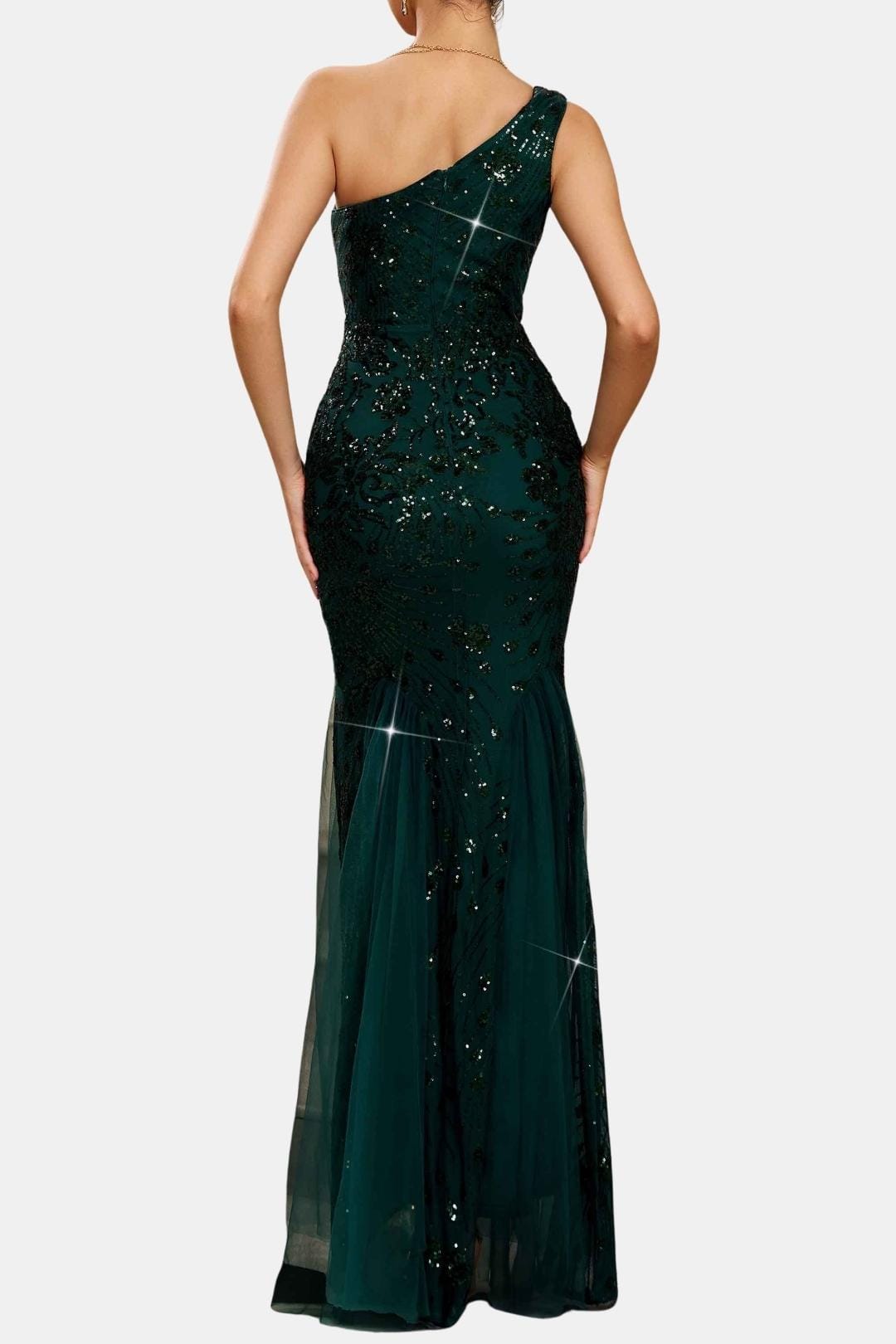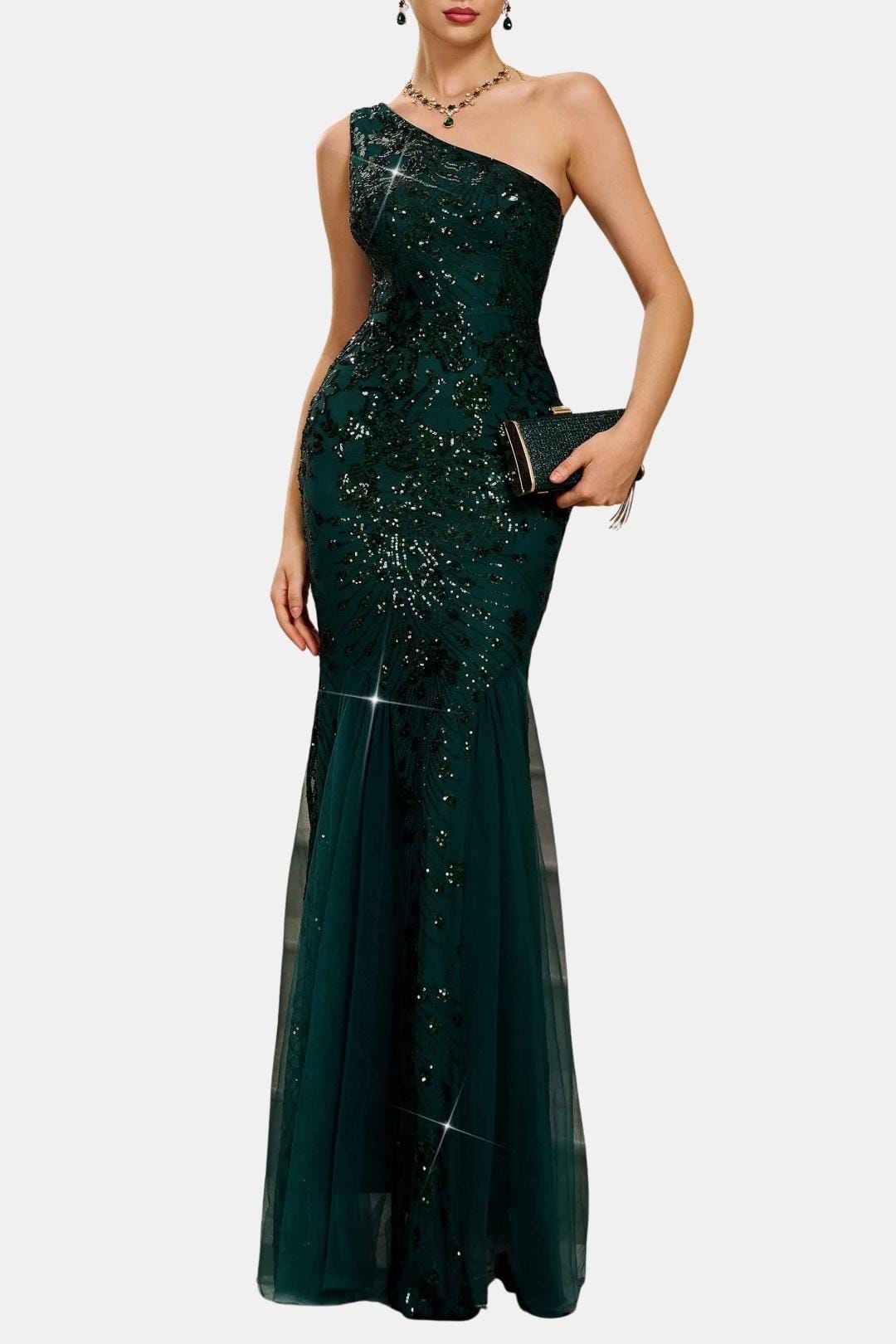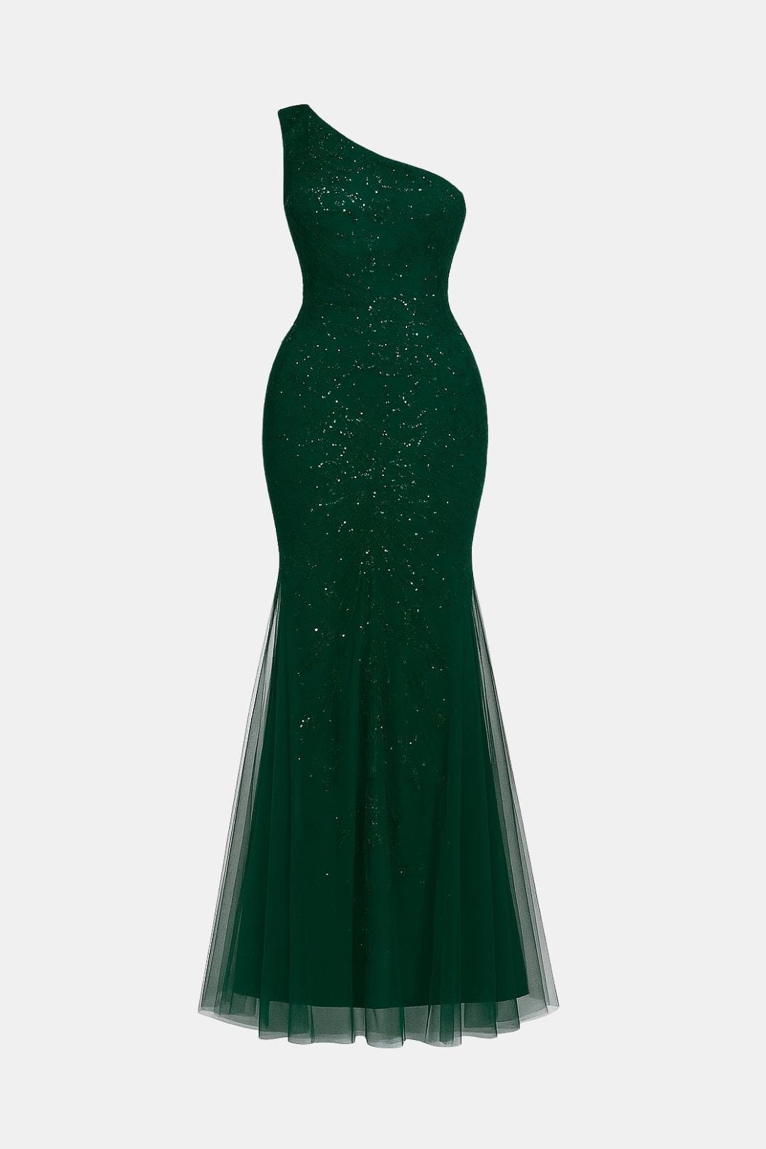 Bea – One Shoulder Mermaid Sequin Evening Dress in Dark Green