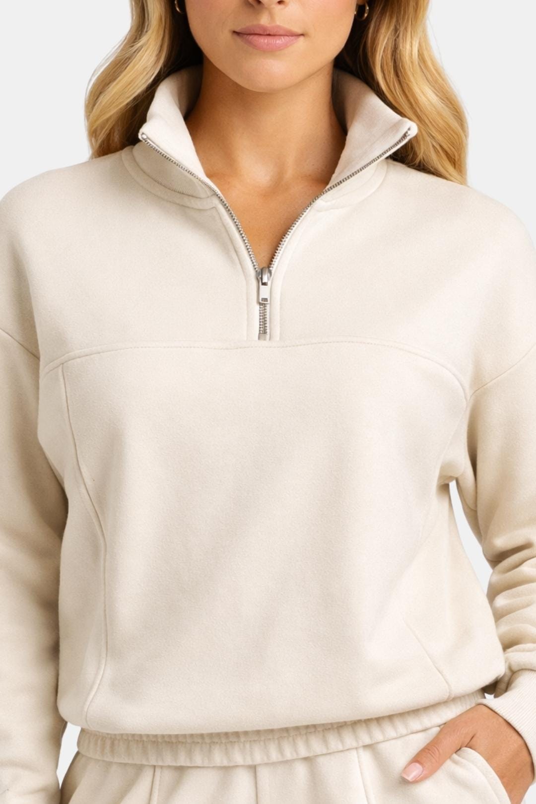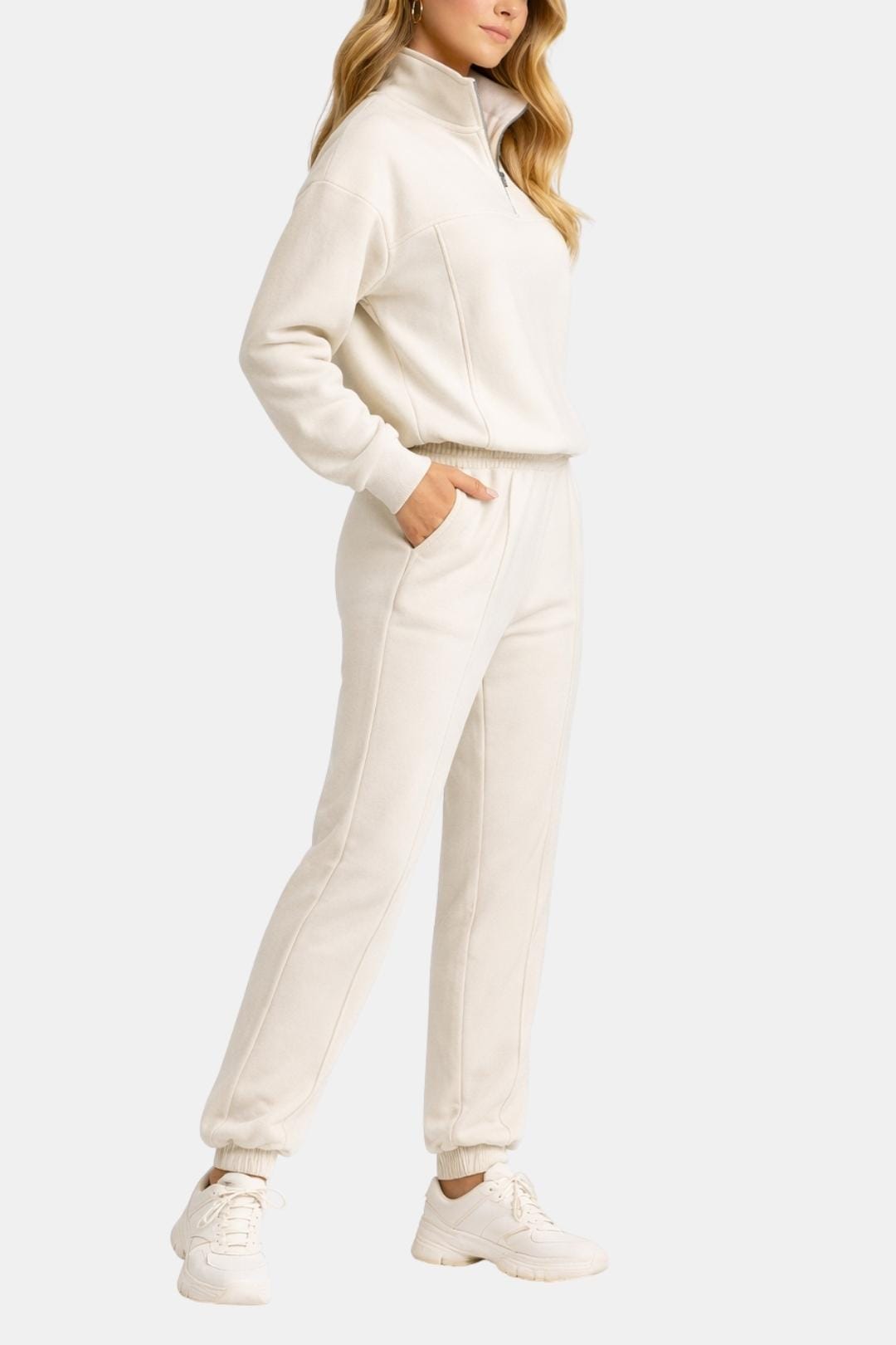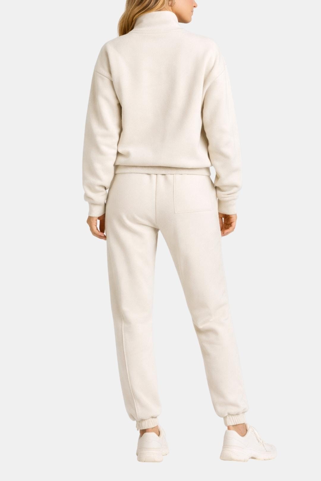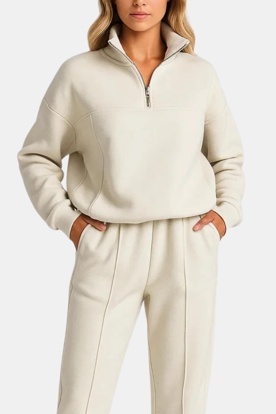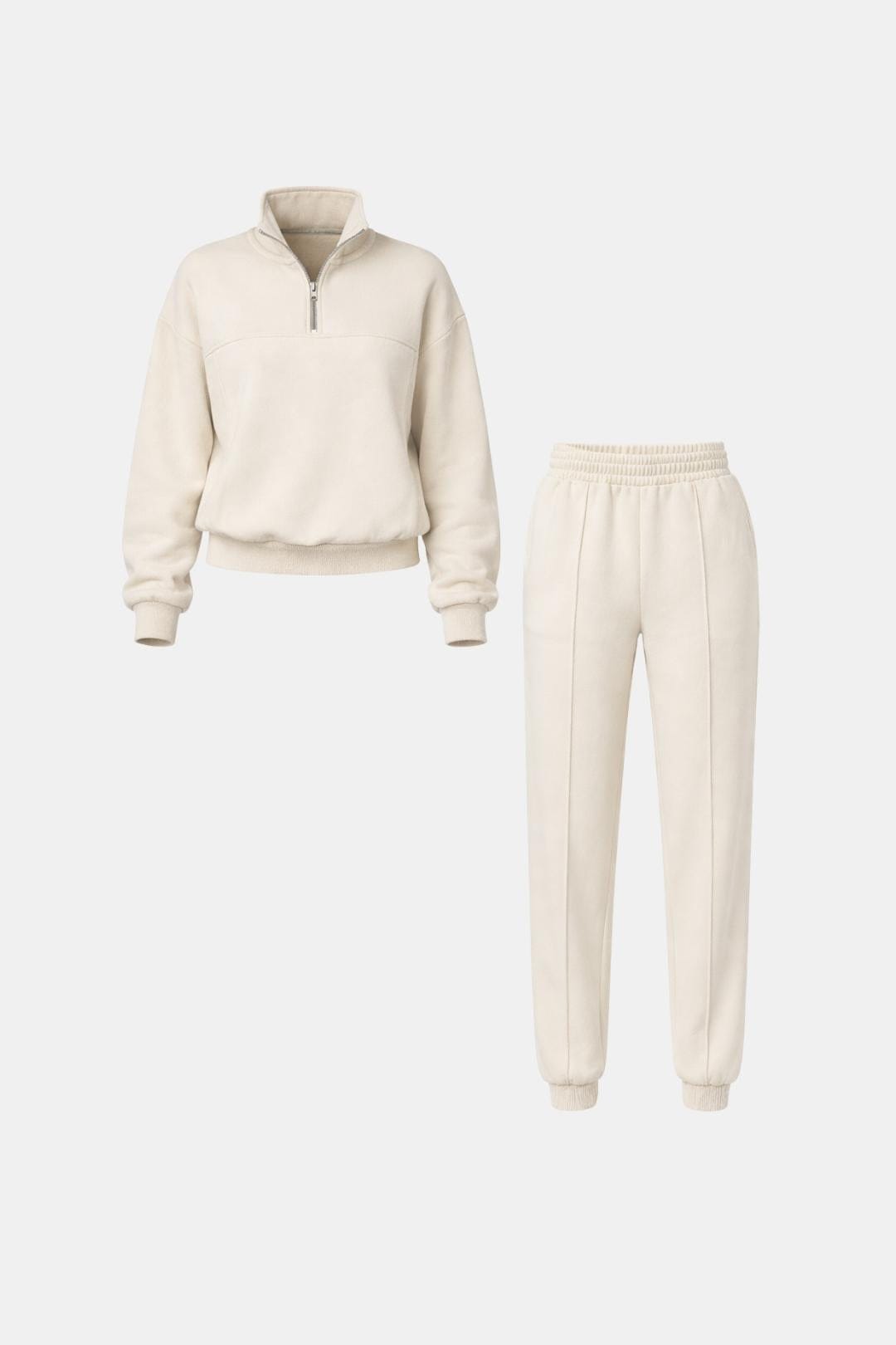 Meet Mikayla — a timeless two-piece lounge set designed for effortless comfort and elevated everyday wear. Featuring a relaxed half-zip sweater paired with matching trousers, Mikayla delivers a clean, minimal look you’ll reach for again and again.