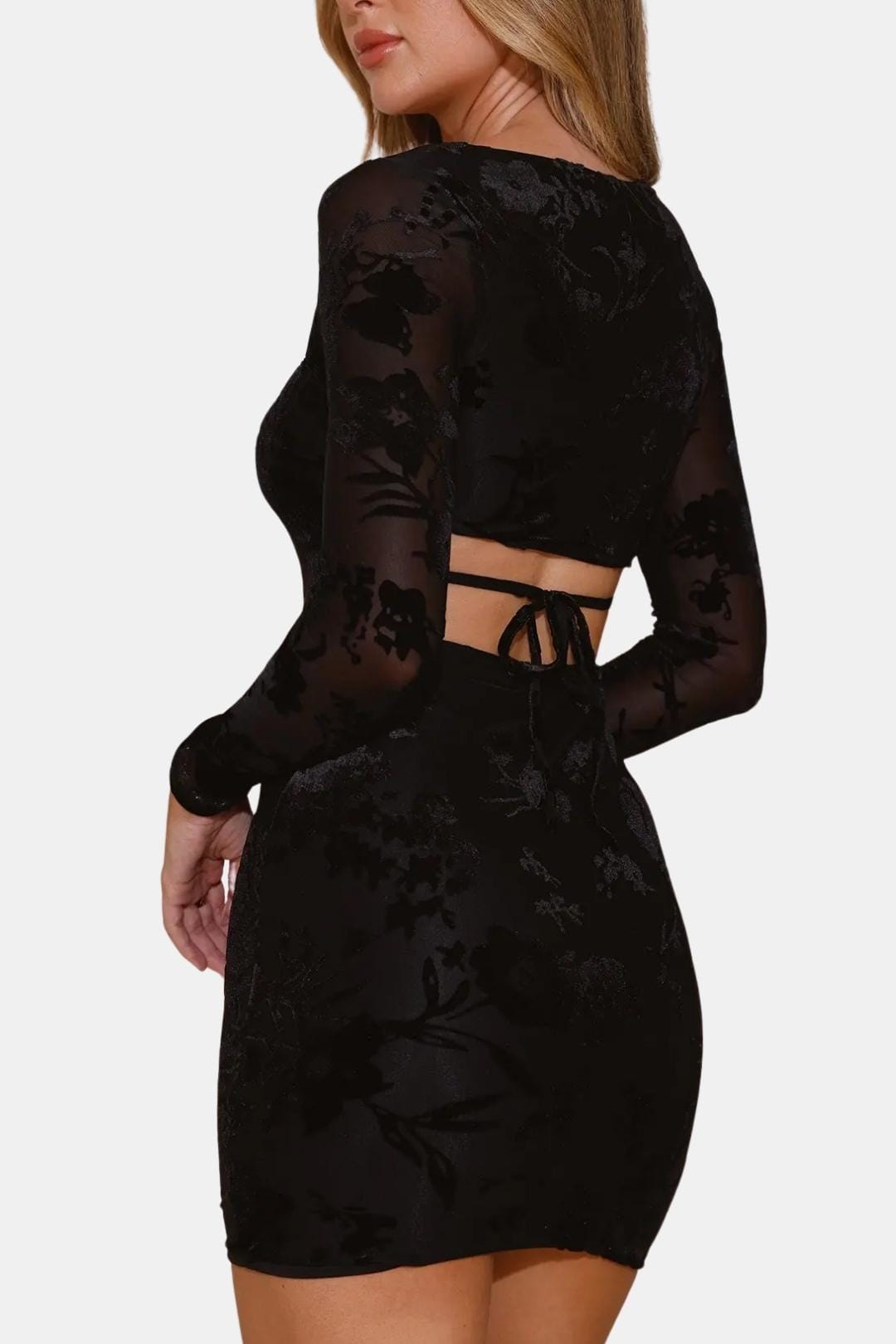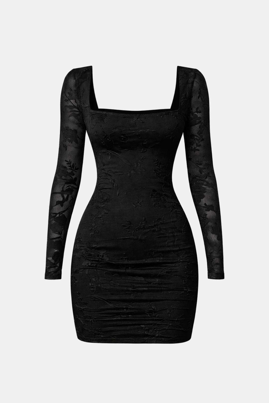 Meet Miranda — a refined long sleeve mini dress designed to balance elegance with modern allure. Featuring a flattering square neckline, sheer lace sleeves, and a body-skimming silhouette, Miranda delivers a timeless look with subtle romance.
