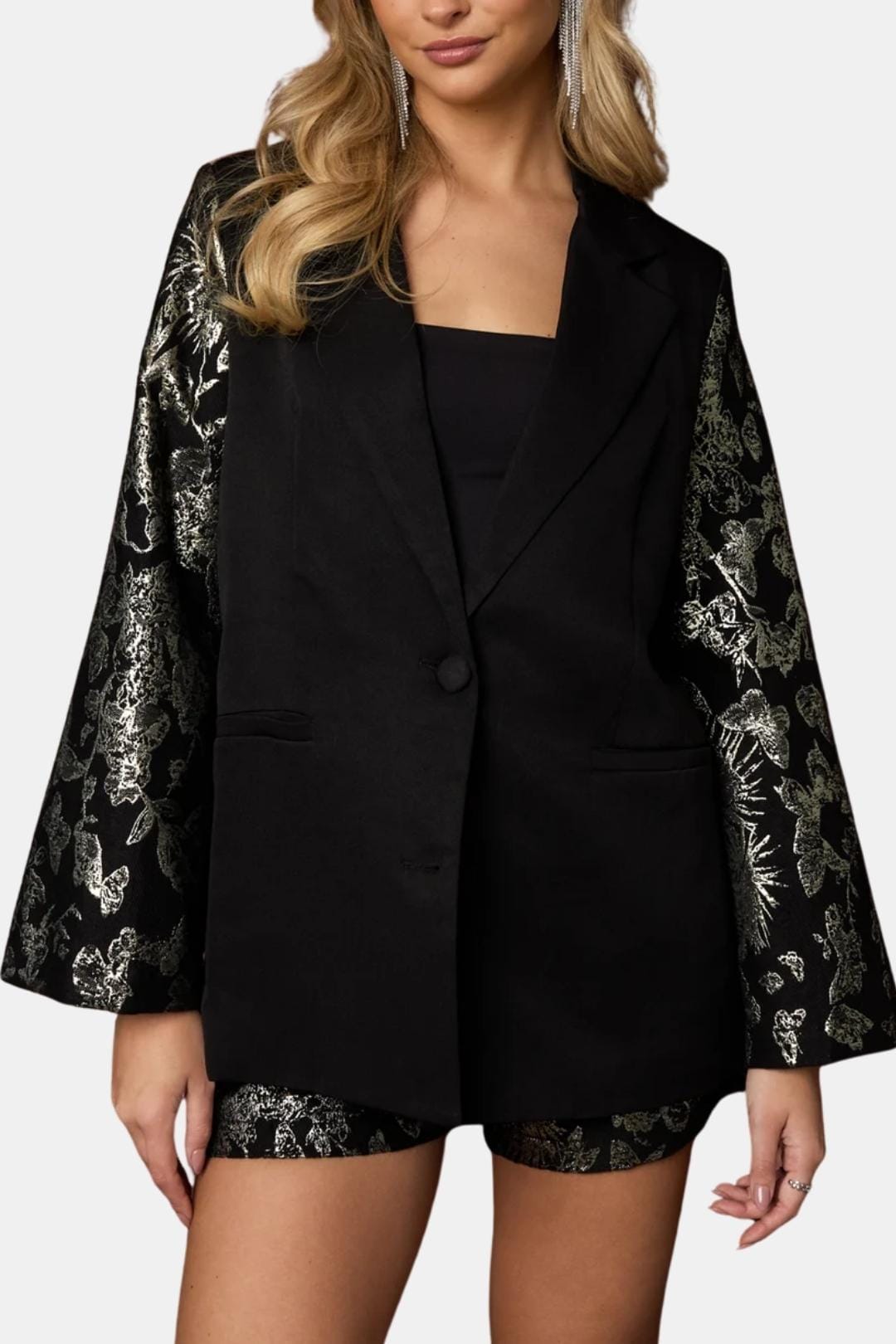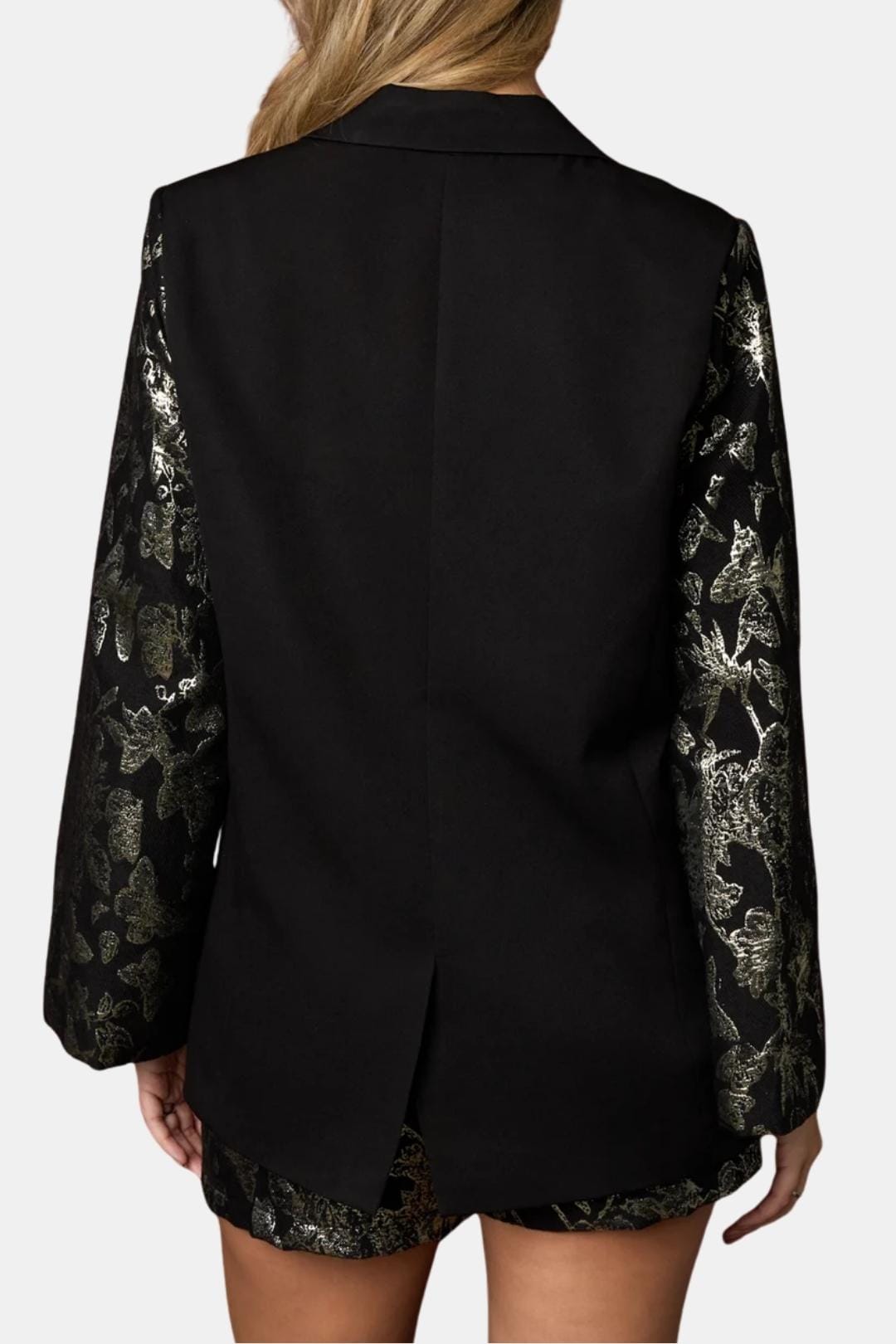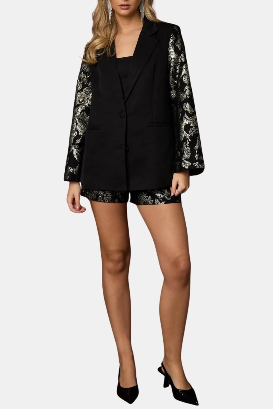 Make a glamorous impression with Carolina — a jacquard-sleeve blazer crafted for standout festive elegance.