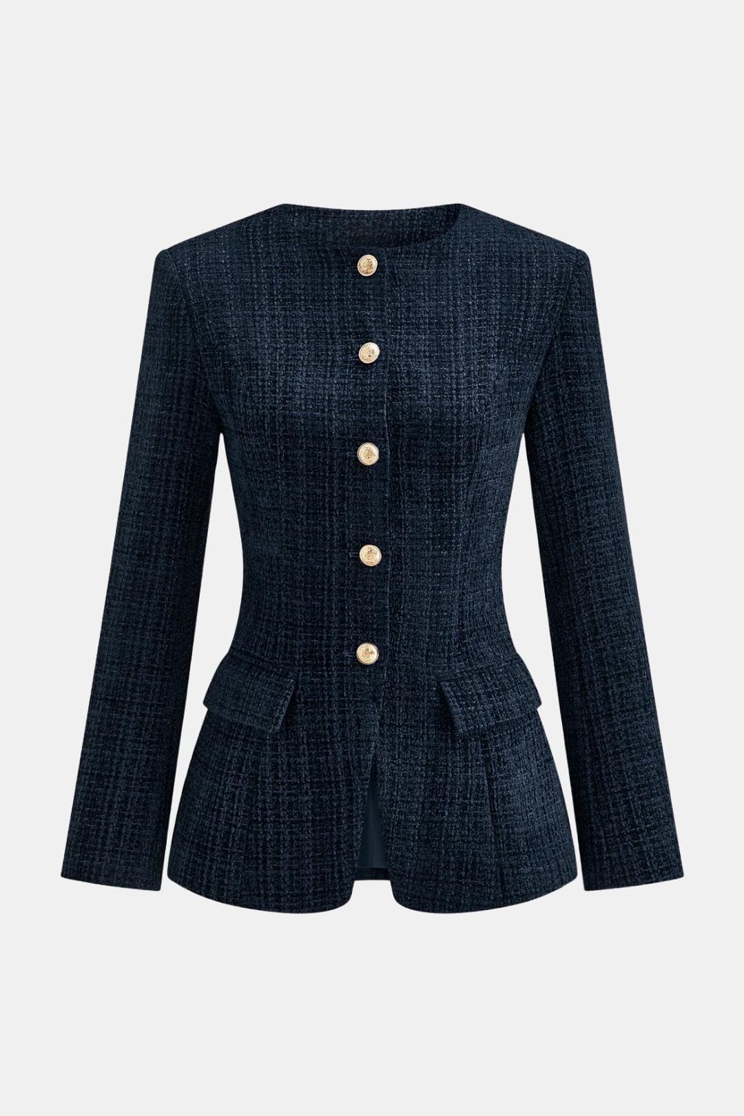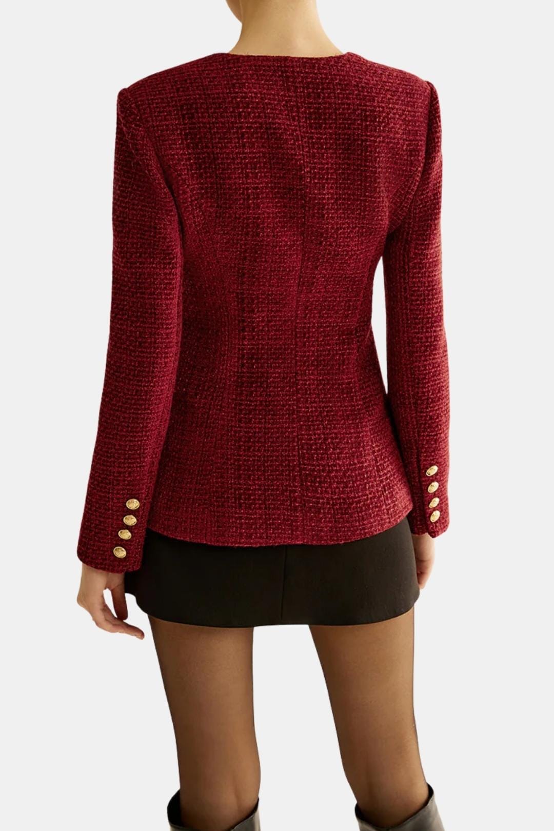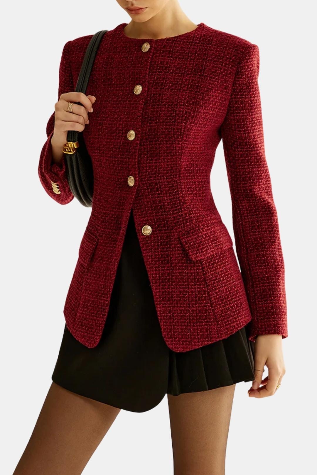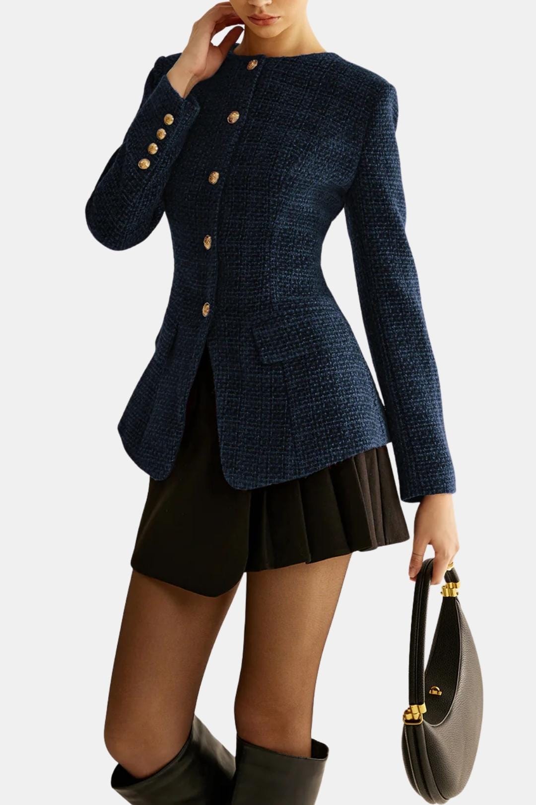 Aesthetics: Textured tweed fabric with statement gold-tone buttons and structured shoulders for a sharp yet graceful look.