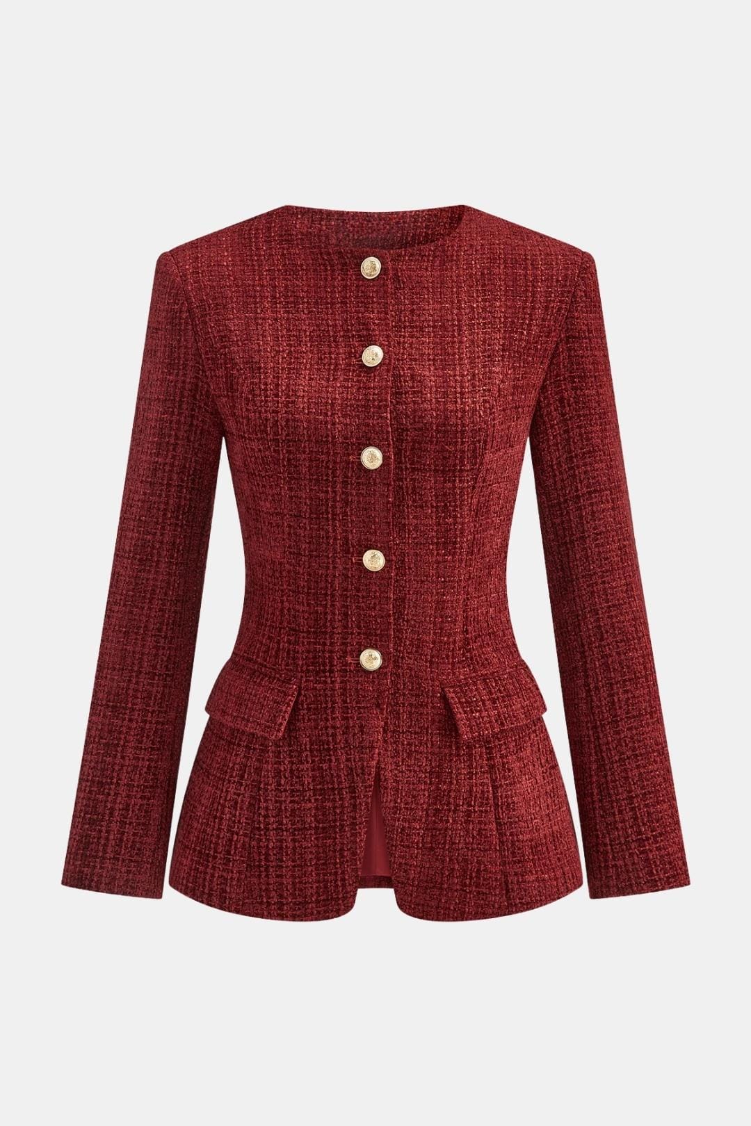 The Julianna – Button Down Slit Tweed Blazer is where classic tailoring meets modern elegance. Designed in a rich burgundy hue, this blazer features refined gold buttons and a sleek slit-front hem that adds a touch of feminine sophistication to any outfit.