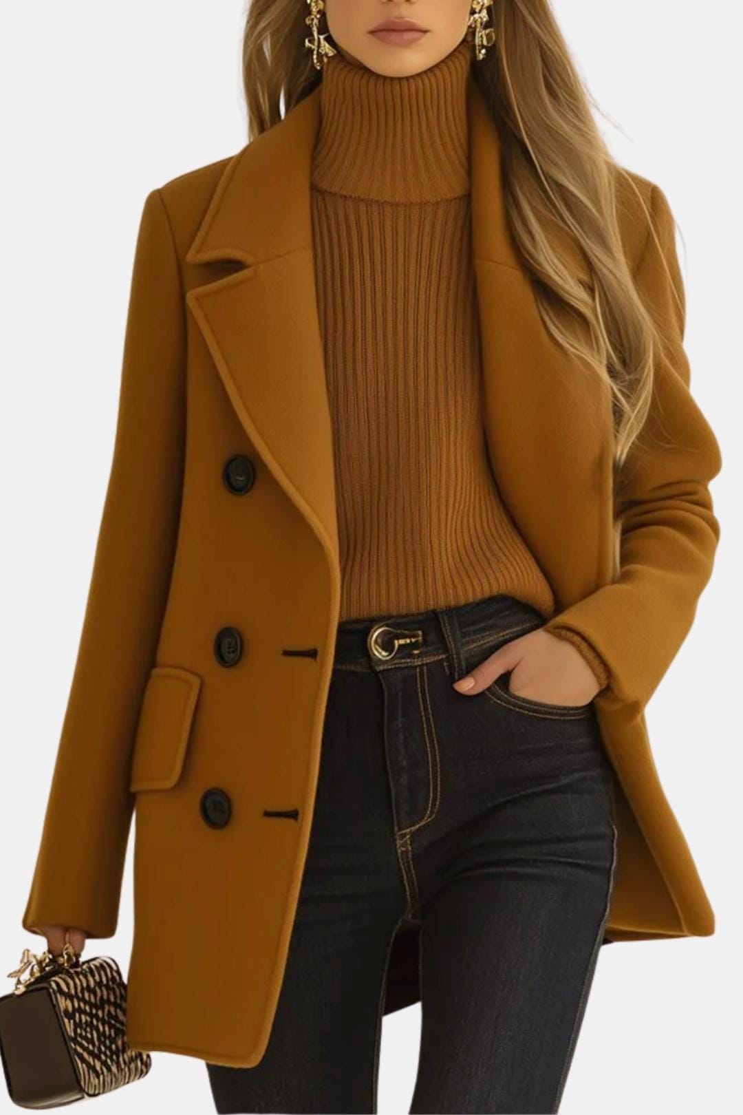 The Tessa – Retro Camel Double-Breasted Coat is the epitome of chic simplicity. Designed for the modern woman, it combines a structured silhouette with vintage-inspired tailoring for a polished and versatile look that transitions seamlessly from workdays to weekends.